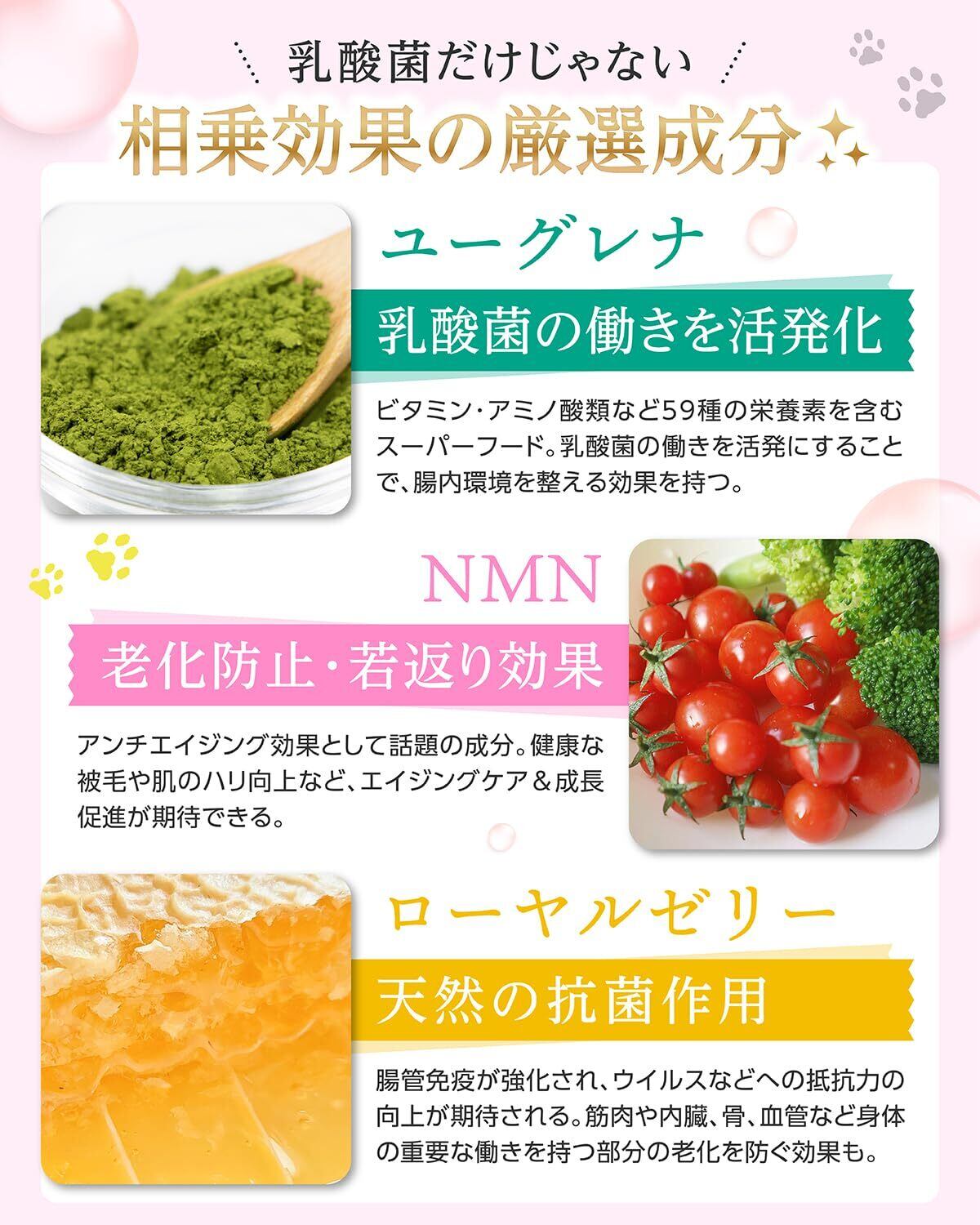 商品特長 お腹の健康サポート, お腹の健康維持による口臭ケア, 免疫サポート, 毛並みや毛艶のサポート