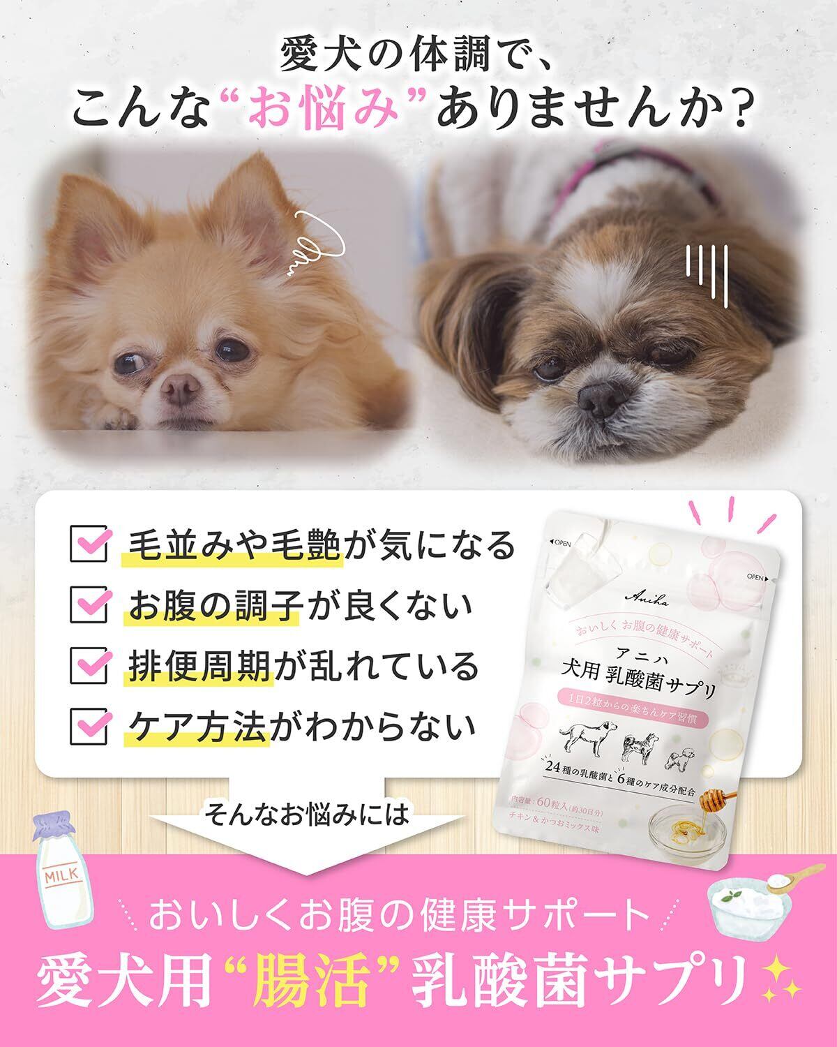 アニハ 犬用“お腹ケア”乳酸菌サプリ【獣医師監修】24種の乳酸菌・ビフィズス菌・オリゴ糖配合 お腹の健康サポート 60粒入り