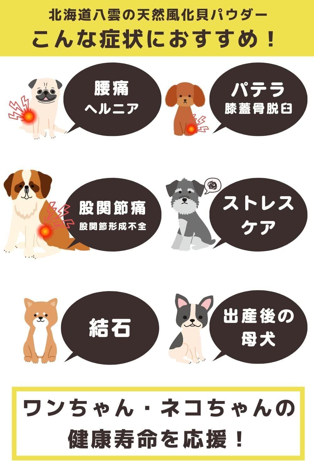 【こんな症状におすすめ】腰・膝・関節などの骨の健康を体の内側から保ち、脱臼や骨折を予防したいワンちゃんやネコちゃんにもおすすめです。また、妊娠や出産、授乳などによって体内のカルシウムを失いがちな母犬のカルシウム補給にもおすすめです。