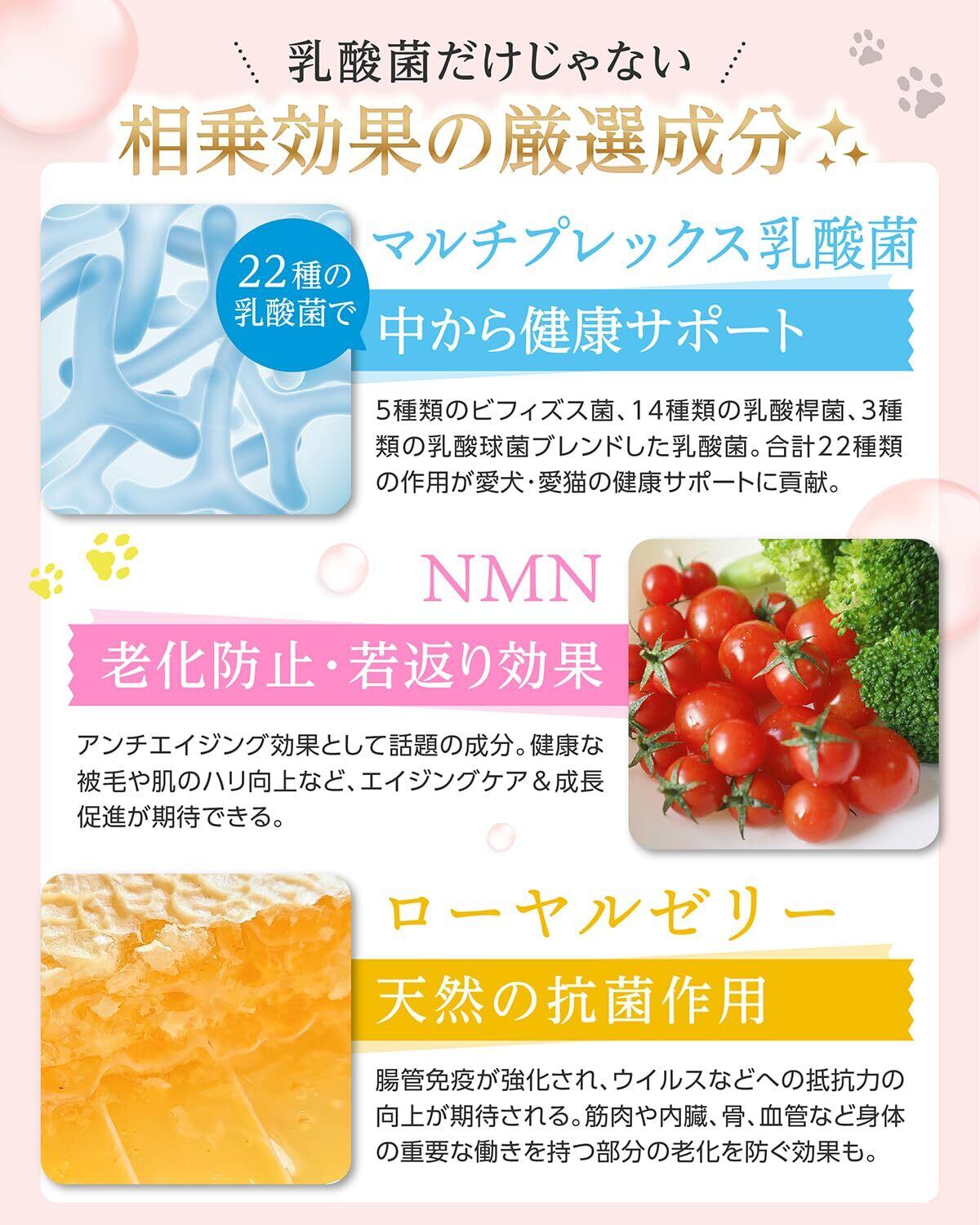 【贅沢7種の強力ケア成分】関節ケアに欠かせないプロテオグリカンやコンドロイチンなど贅沢7種のケア成分に加えて、話題のNMNや22種の乳酸菌で足腰関節の健康維持を強力サポート!