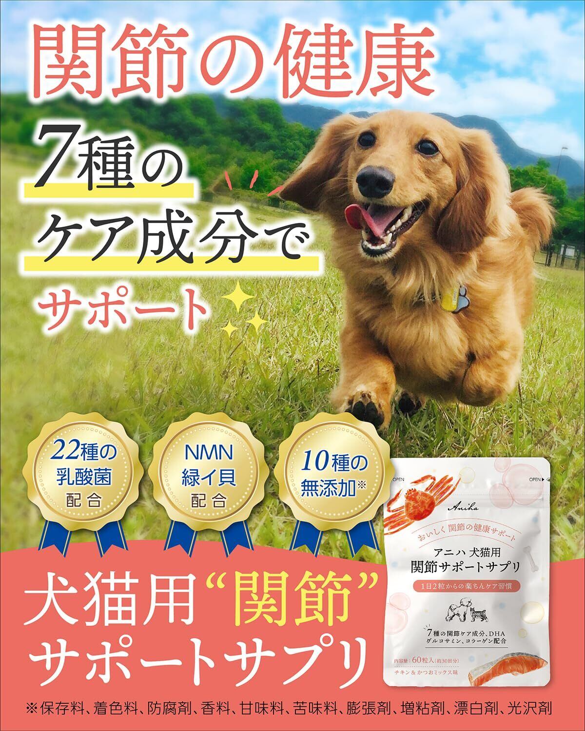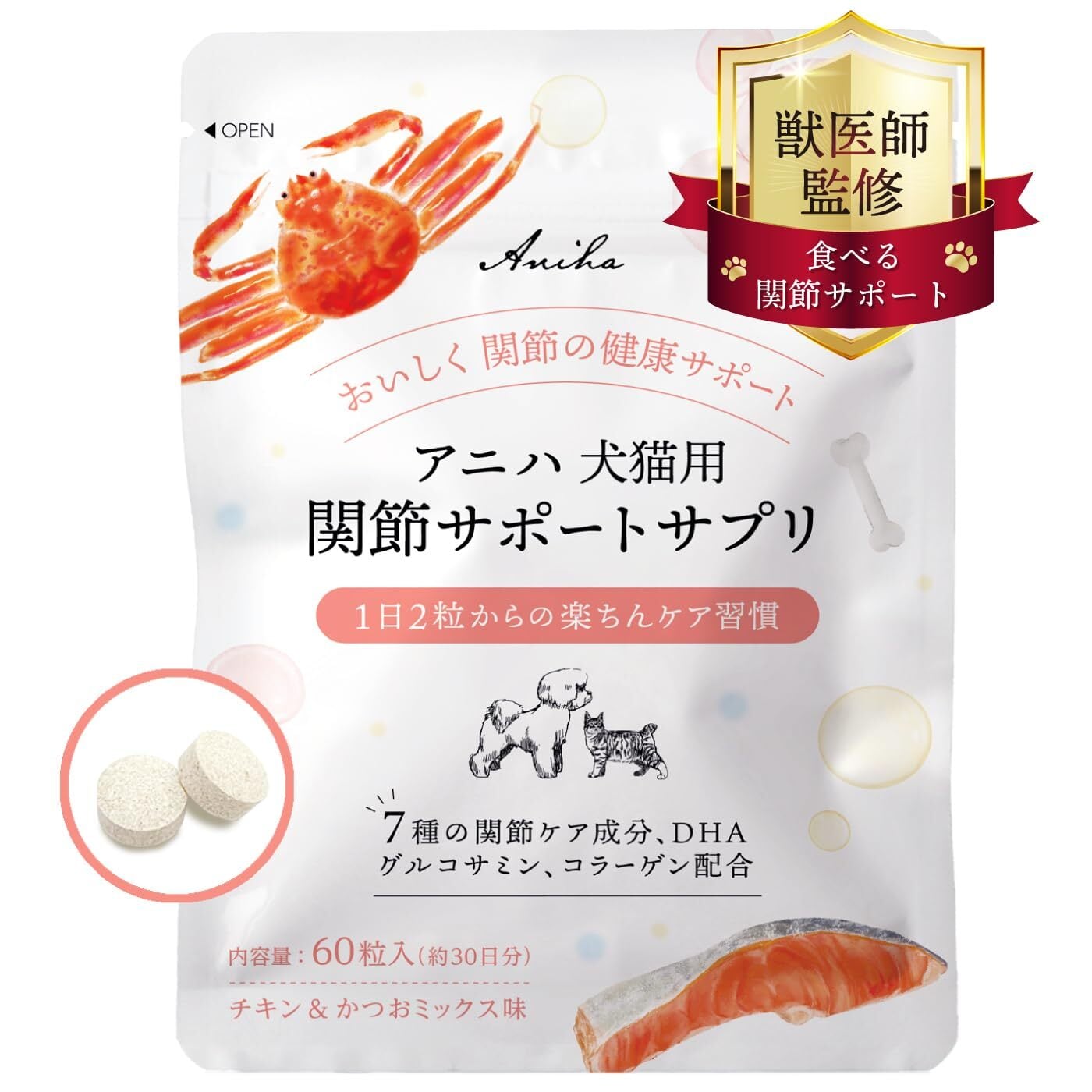 アニハ 犬猫用 関節サポートサプリ【獣医師監修】7種の関節ケア成分・緑イ貝・NMN・グルコサミン・コンドロイチン・コラーゲン配合 60粒入り