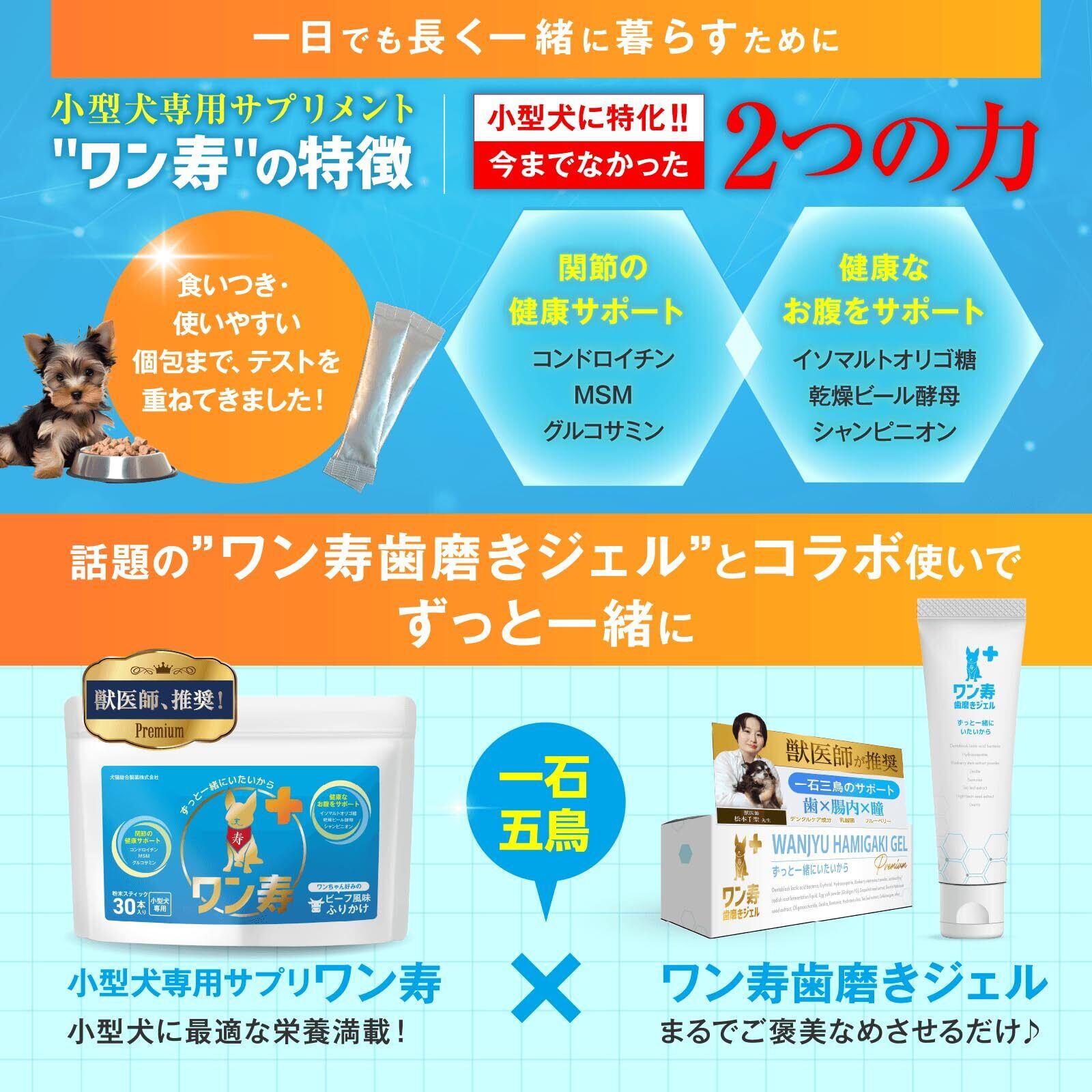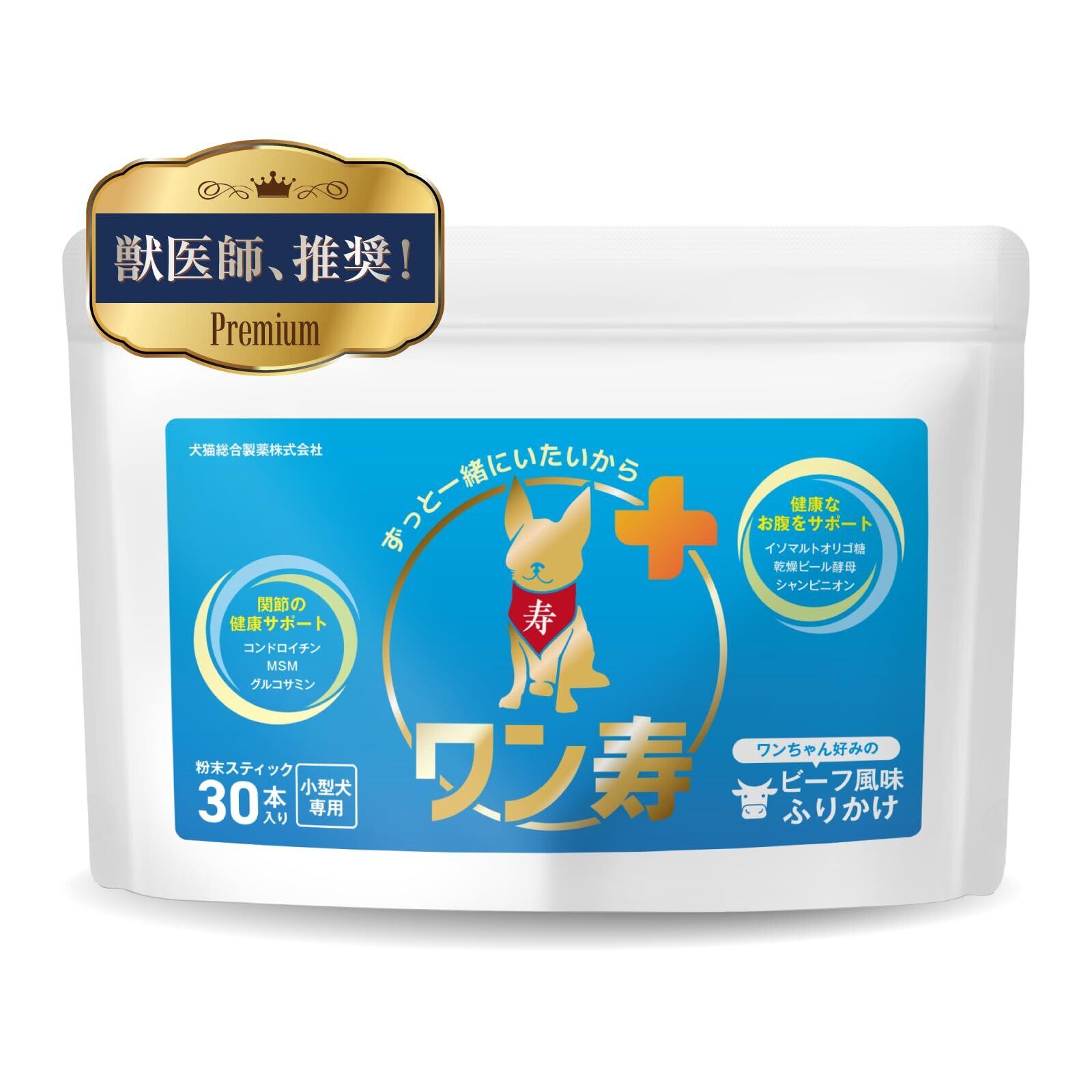 【獣医師監修】ワン寿 わんじゅ 小型犬用 ふりかけ型サプリ 関節 お腹 ダブルの健康サポート 美味しいビーフ味 使いやすい個包装 (30本入) (1)