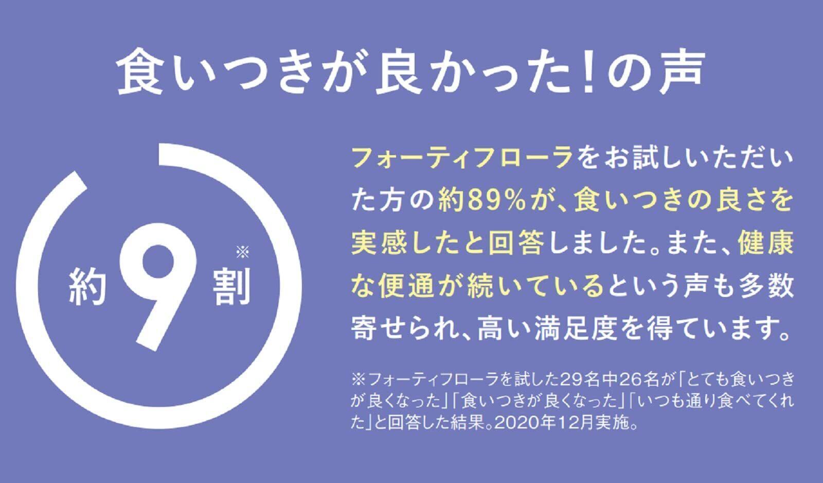 プロバイオティクスサプリメント(乳酸菌サプリメント)。「フォーティフローラ」をお試しいただいた方の約89%が、食いつきの良さを実感したと回答しました。また、健康な便通が続いているという声も多数寄せられ、高い満足度を得ています。