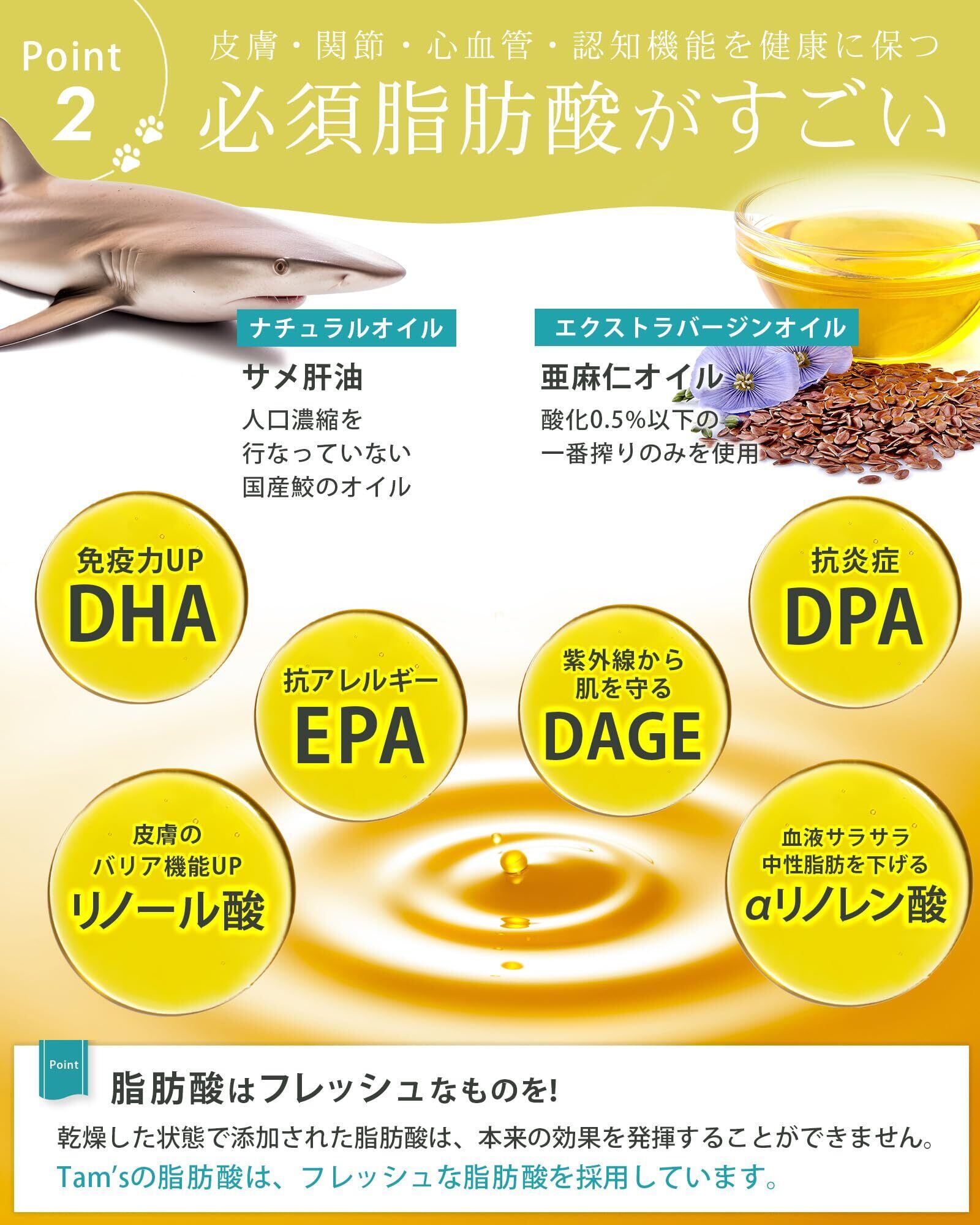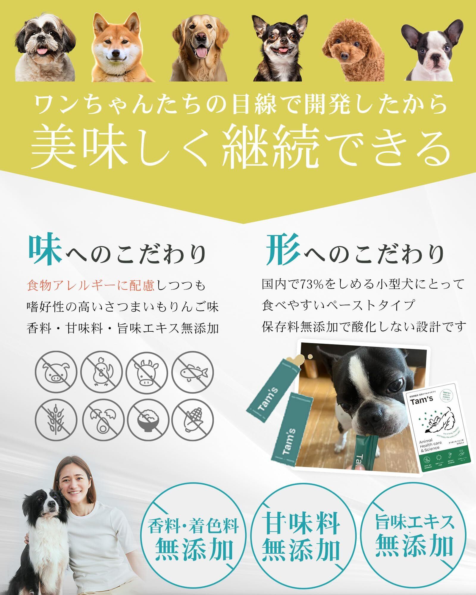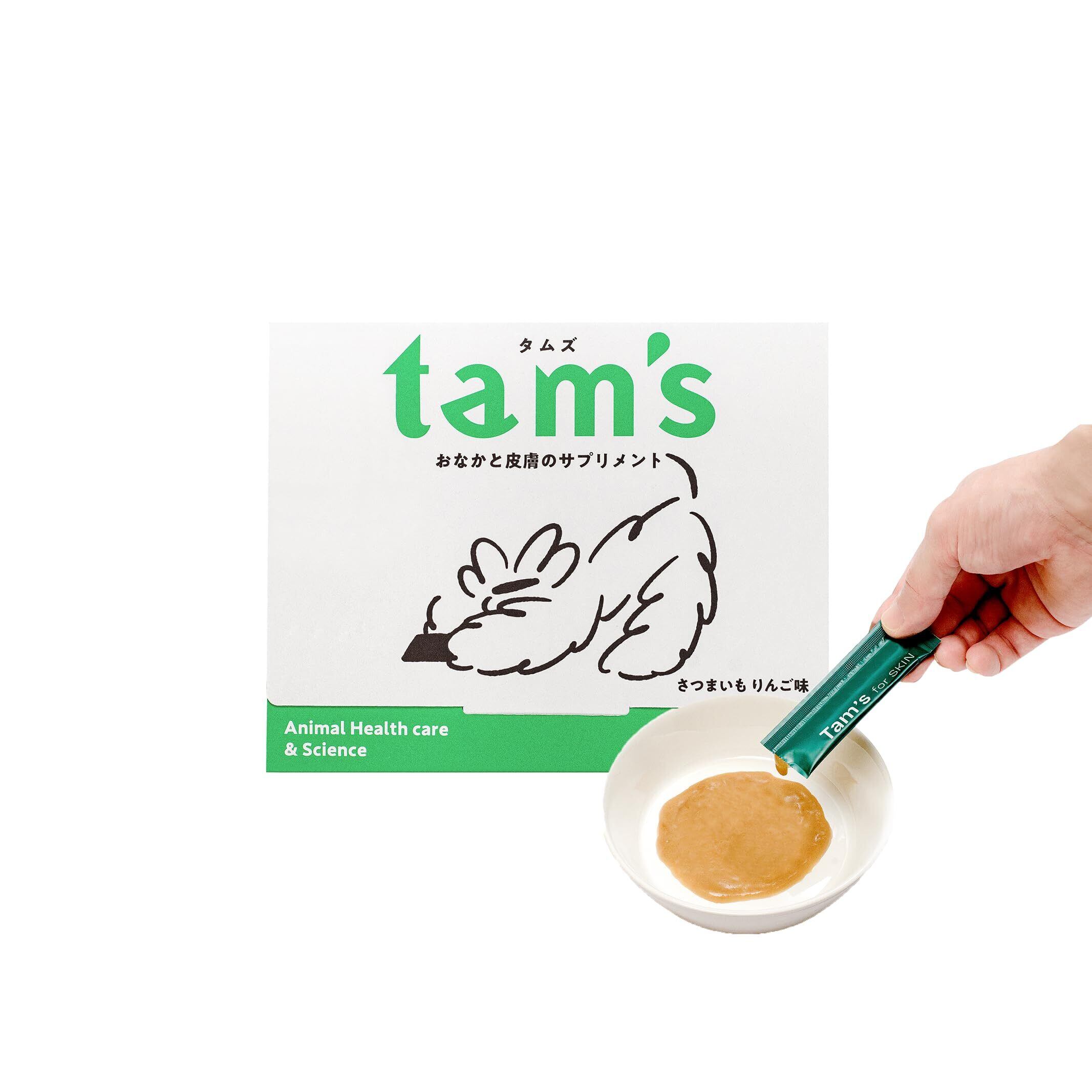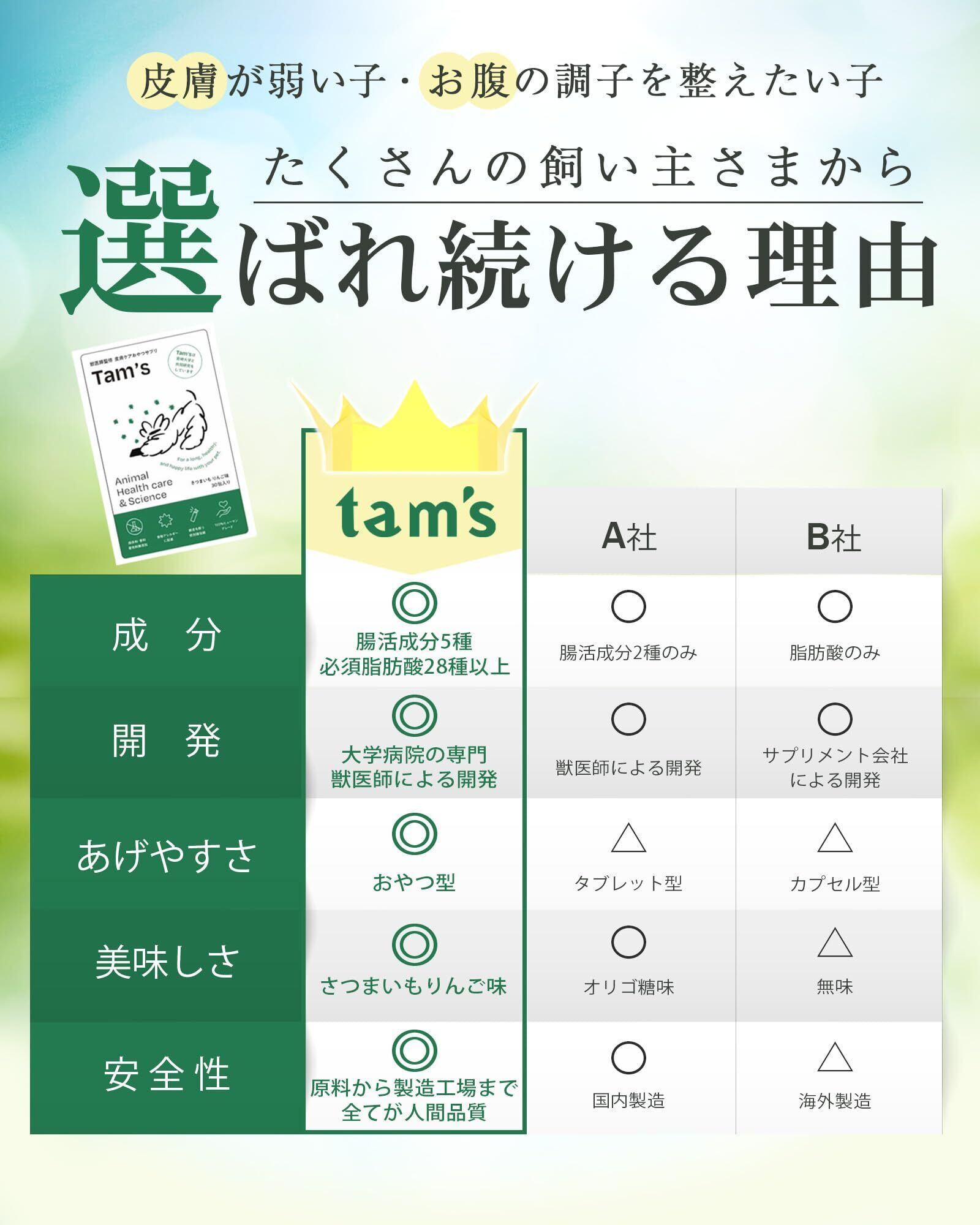 tam'sは、病院で選ばれている犬の皮膚の健康維持のためのおやつ型サプリメントです。プロ/プレバイオティクスの腸活成分とフレッシュオイルを含んだ、皮膚のためのオールインワンサプリ。 tam'sのこだわり抜いた成分️乳酸菌を始めとるす腸活成分:3種の善玉菌 パラカゼイ菌(乳酸菌) 一包あたり約60億個配合。パラカゼイ菌は皮膚のかゆみなどのトラブルやストレスなどが起きて腸内フローラが乱れている犬にとって最も有効であるという論文が発表されています。 酪酸菌 一包あたり約3000万個配合。酪酸を作り出す生菌です。腸の活動のエネルギー源となり腸を粘膜でサポートします。 ビフィズス菌 一包あたり約30億個配合。健康な大腸の大部分を占めるビフィズス菌は、加齢やストレスで減ってしまうことが知られています。 2種のプレバイオティクス ケストース フラクトオリゴ糖の一種で、最も素早く多様な善玉菌を増やすケストース。アトピーの犬にケストースとパラカゼイ菌を90日間与え続けた研究では、ステロイドの薬を減らすことができたと発表されています。体内にもともと棲んでいる善玉菌にも作用して、腸内フローラを活性化させます。 グァーガム 豆からできた水溶性食物繊維です。腸内細菌にとって、発酵率・分解率の高い優秀なエサとなります。 腸内環境を整えることで、下痢、便の臭い(便臭)、便の硬さが気になるワンちゃんのケアができます。 ️かゆみ止め、下痢止め、アトピー、整腸剤、皮膚炎サプリ、便活、臭活、腸活に使っていただいています。 ️2種の高品質オイル:サメの肝油 DHA・EPA・DPA・DAGEなど18種類以上の必須脂肪酸を豊富に含むサメの肝油を配合しました。 国産の鮫からとれた、人口濃縮を行なっていないナチュラルオイルです。 亜麻仁オイル αリノレン酸、リノール酸など10種の脂肪酸を含むエキストラバージン亜麻仁オイルを配合。 酸化が極めて早い特徴を持つ亜麻仁オイルですが、Tam'sに配合されているのは酸化0.5%以下の一番搾りのみです。 ️さつまいもリンゴ味のおやつ型:本製品の特徴は、体の内側から皮膚や体質にゆっくりアプローチしていくサプリメントであるという点です。毎日続けていただくことが大切だからこそ、与える時間も楽しんでもらえるよう、わんちゃんの大好きな魚の風味にりんごとさつまいもで美味しく優しい味付けをしています。 ️こんなことでお悩みのわんちゃん:かゆみ、脱毛、黒ずみ、下痢、便秘、便臭