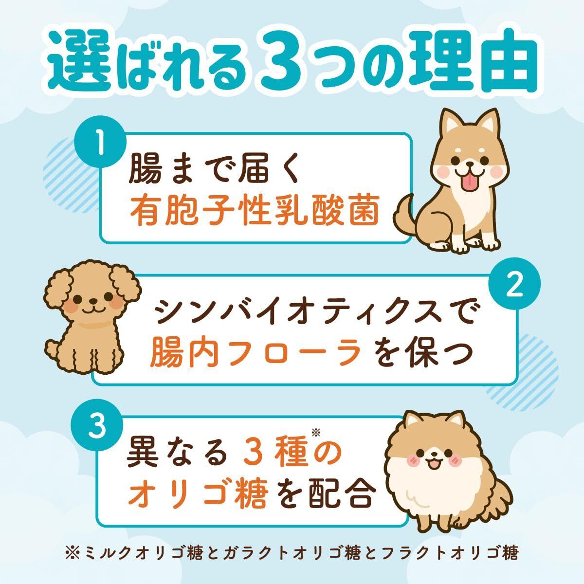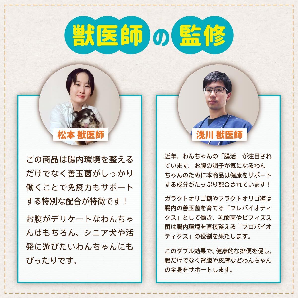 【獣医師と共同監修】 この製品は、腸内フローラのバランスを整えることを目的に、獣医師とドッグヘルスケアアドバイザーのW監修のもと開発されました。乳酸菌やフェカリス菌などの有効成分を配合し、全身の健康をサポートします。