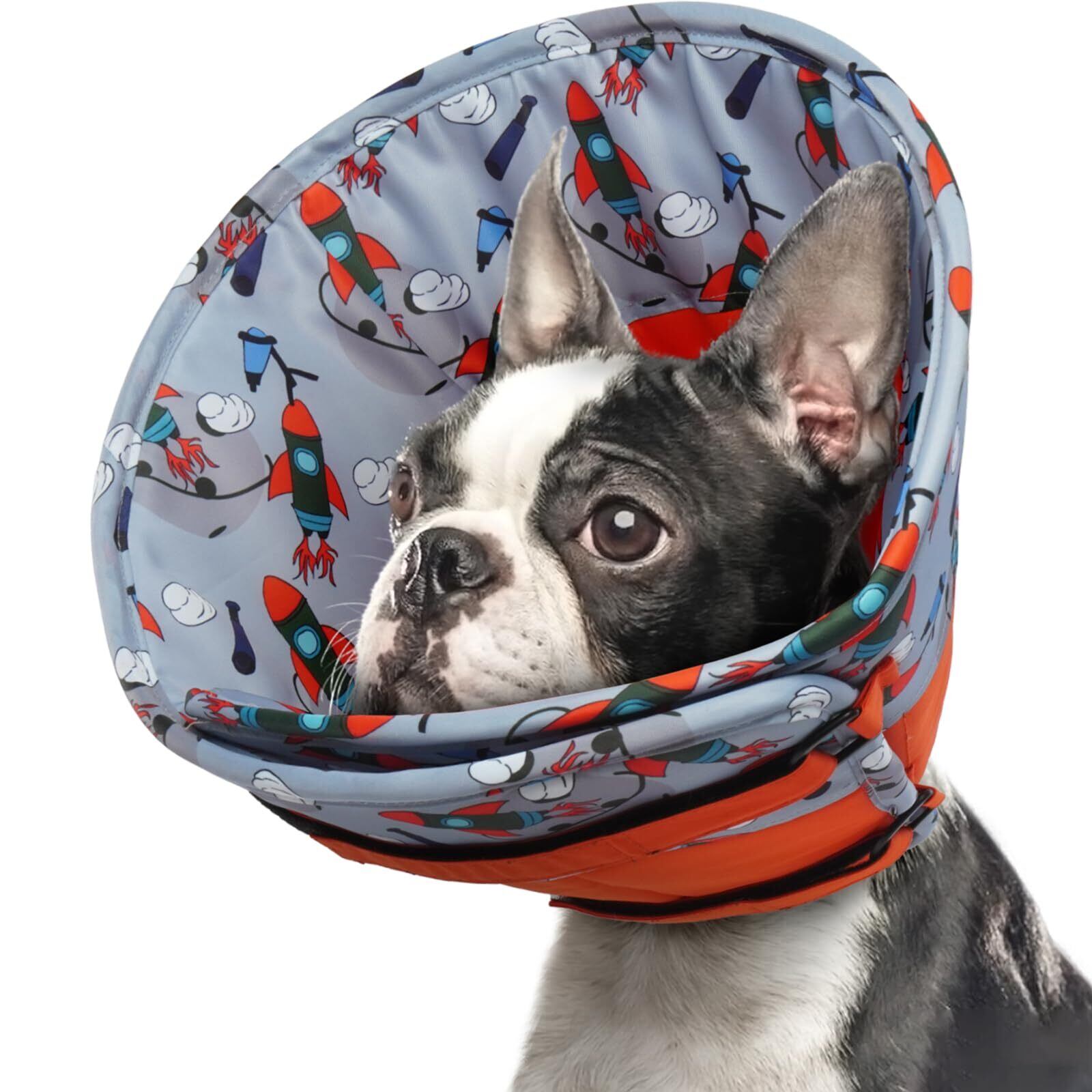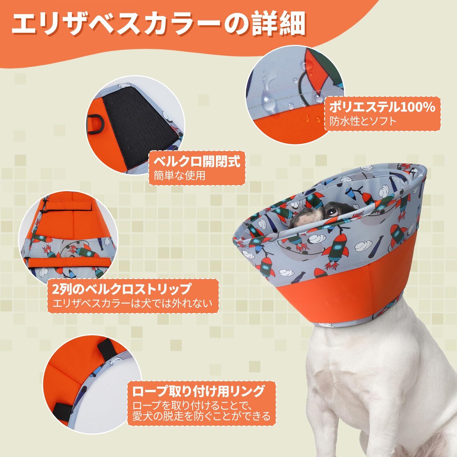 ソフトでサポート力抜群:ポリエステル100%の生地を使用したこのエリザベスカラー 犬は、防水性とサポート力に優れ、愛犬が傷口を舐めたりひっかいたりするのを万全に防ぎます。小さなロケットの模様がキュートで、愛犬のくすんだ回復過程に彩りを添えます。エリザベスカラーは洗濯機で洗えますので、愛犬の快適な生活のために、エリザベスカラーがお手元に届きましたら、ご使用前に洗濯してください