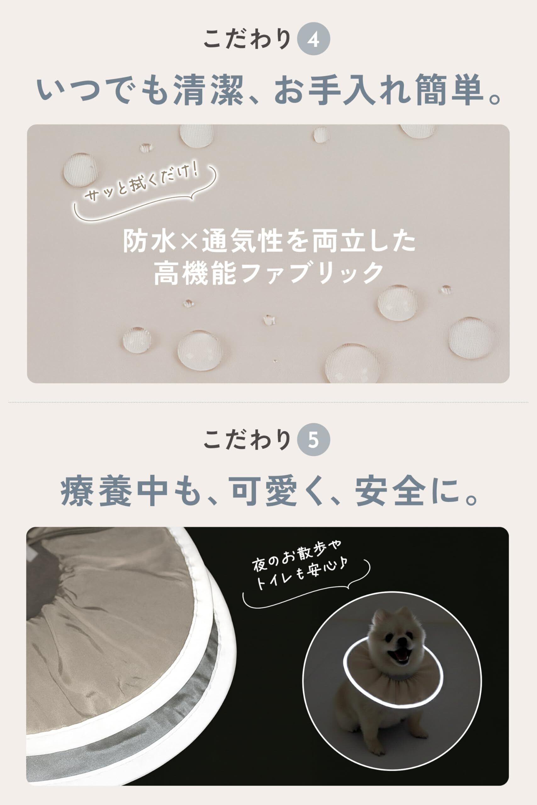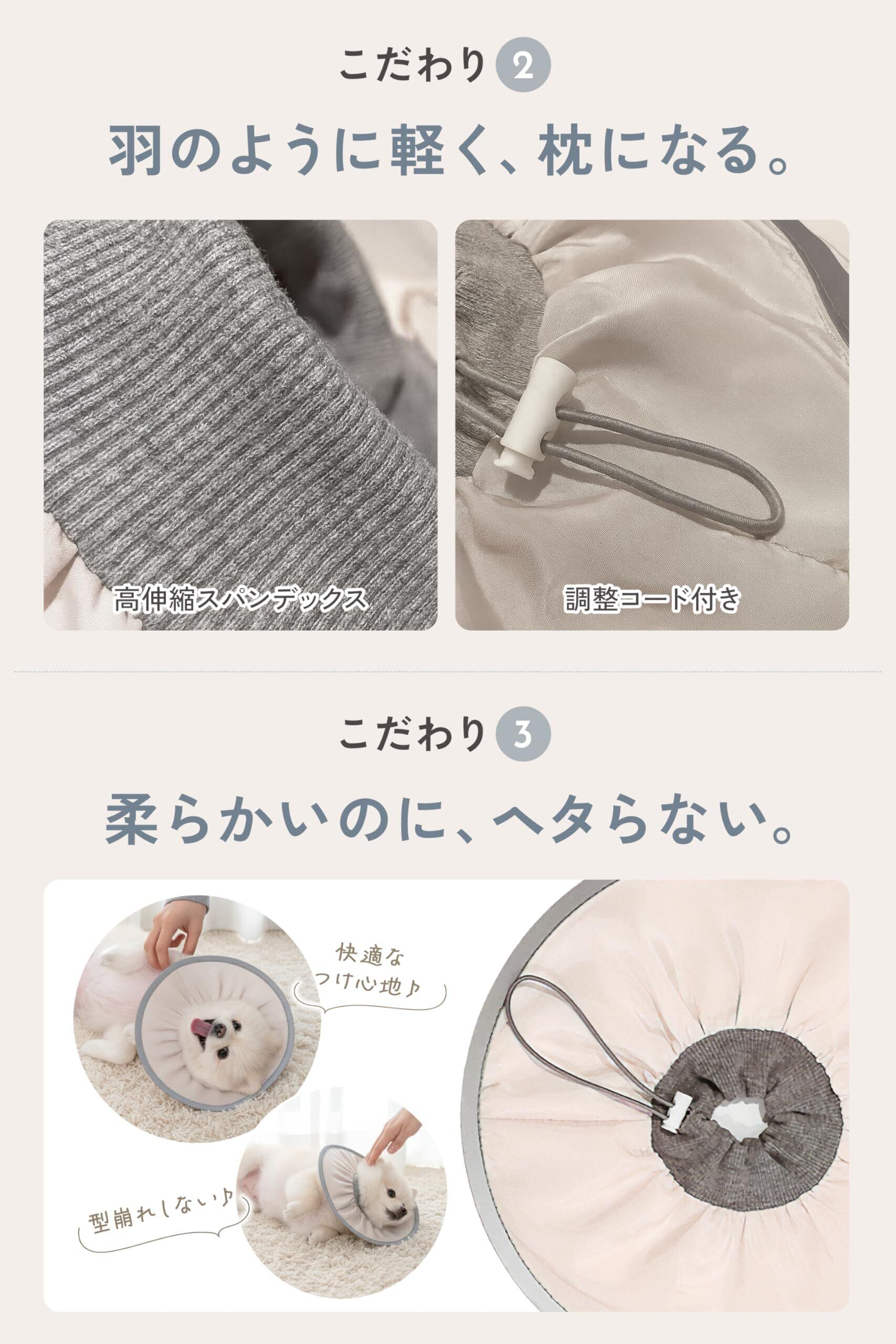 軽量約30gのフラット設計で首への負担を抑え、装着したままでも寝る・歩くなど日常動作を妨げにくいエリザベスカラー。伸縮素材と調整コードでやさしくフィットし、ずれにくい着用感を実現。弾性ワイヤー内蔵で形状を保ちつつ視界を遮りにくい仕様。防水・撥水加工でお手入れ簡単、暮らしになじむニュアンスカラー展開。S・M・Lの3サイズ、犬猫兼用で日常ケアや術後の舐め防止に対応。