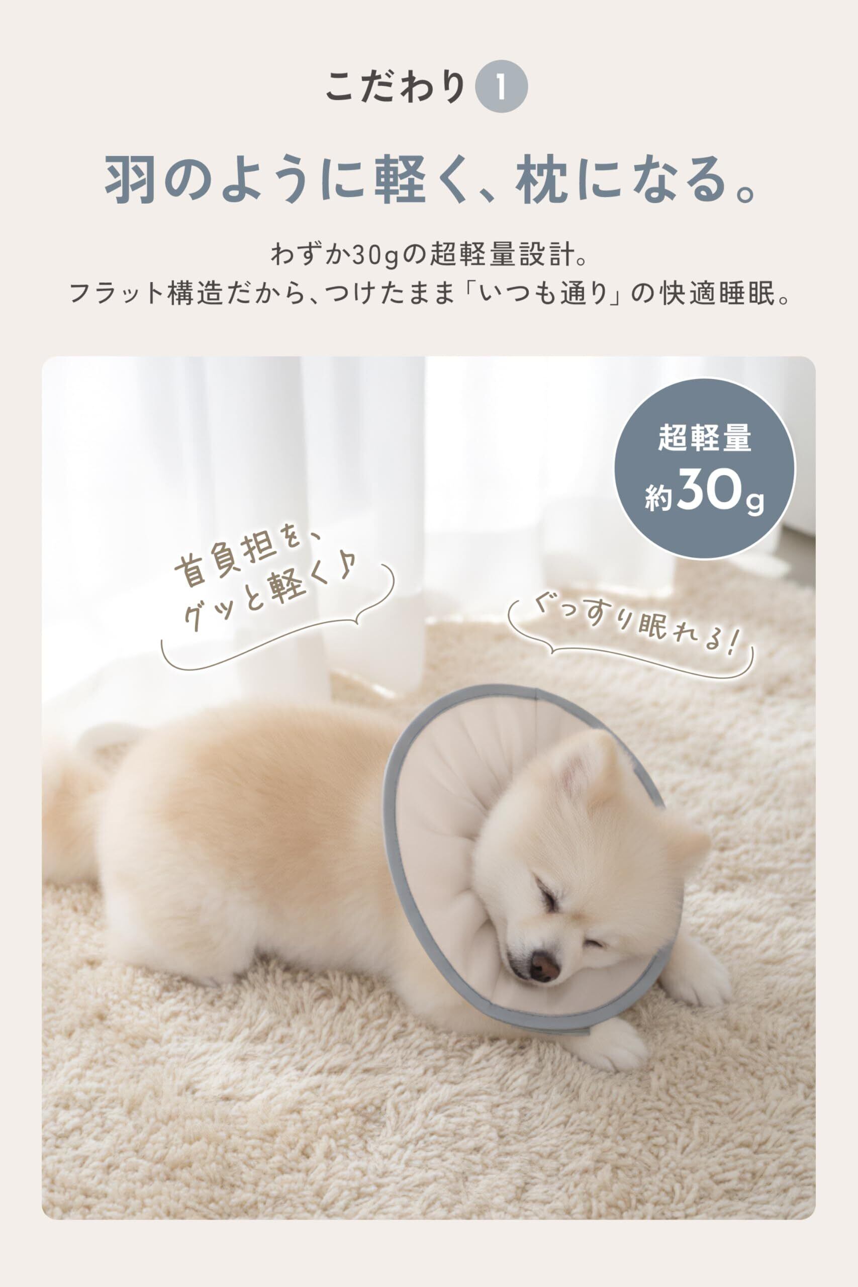 【ストレスを考えたフラット設計】 従来の硬いエリザベスカラーとは異なり、フラット構造を採用。約30gの軽量設計で首への負担を抑え、装着したままでも自然な姿勢で過ごせます。寝る・歩く・くつろぐといった日常動作を妨げにくい設計です。