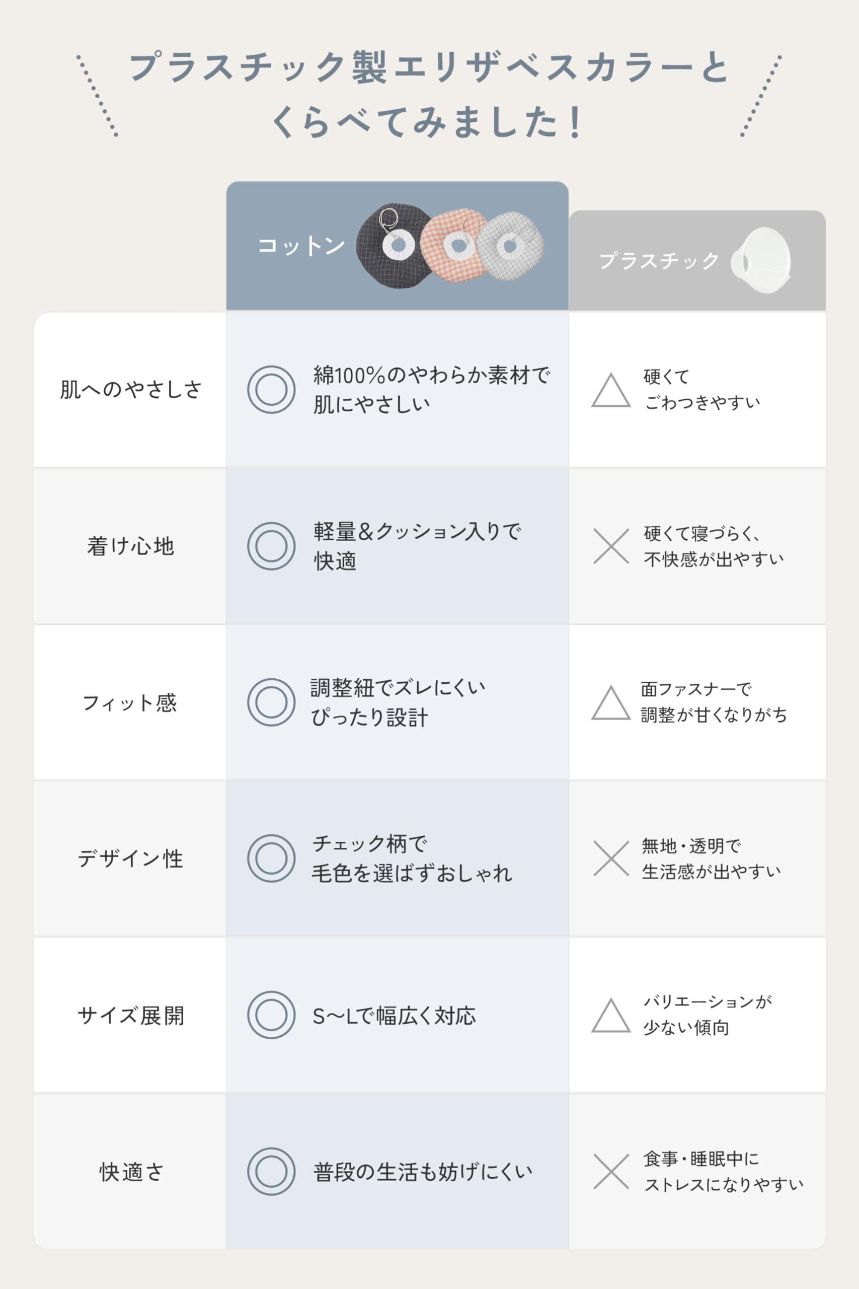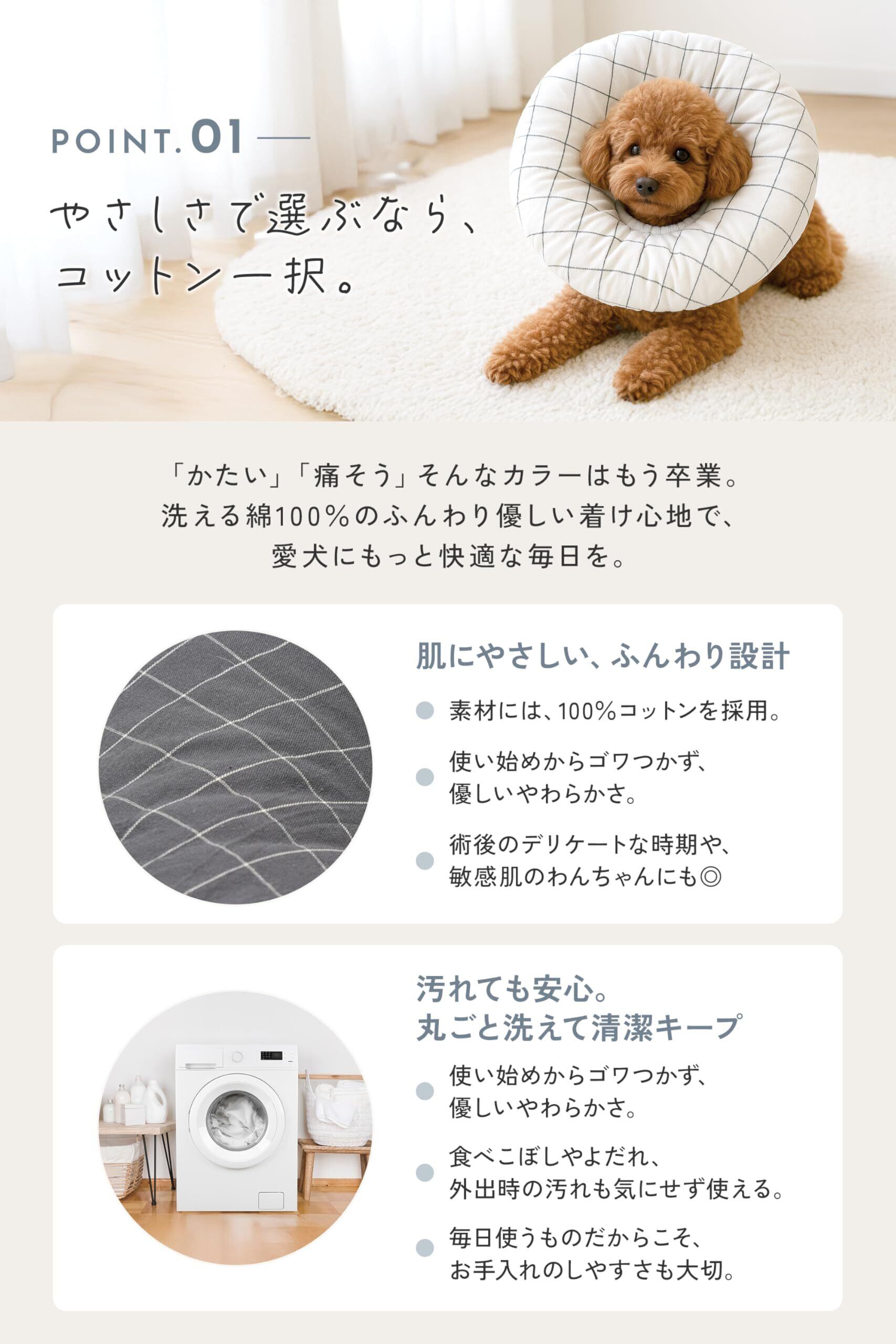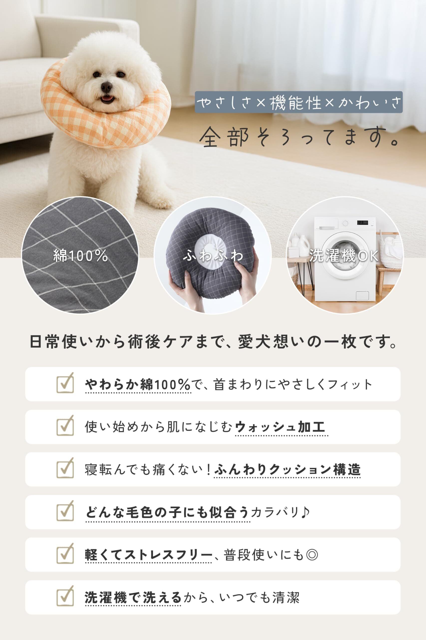 【デザイン性】 「エリザベスカラー=目立つ」という印象をやさしく更新。チェック柄を基調としたニュアンスカラーで、毛色を選びにくく、お部屋やお洋服にもなじみます。かわいらしさと暮らしへのなじみを両立しました。