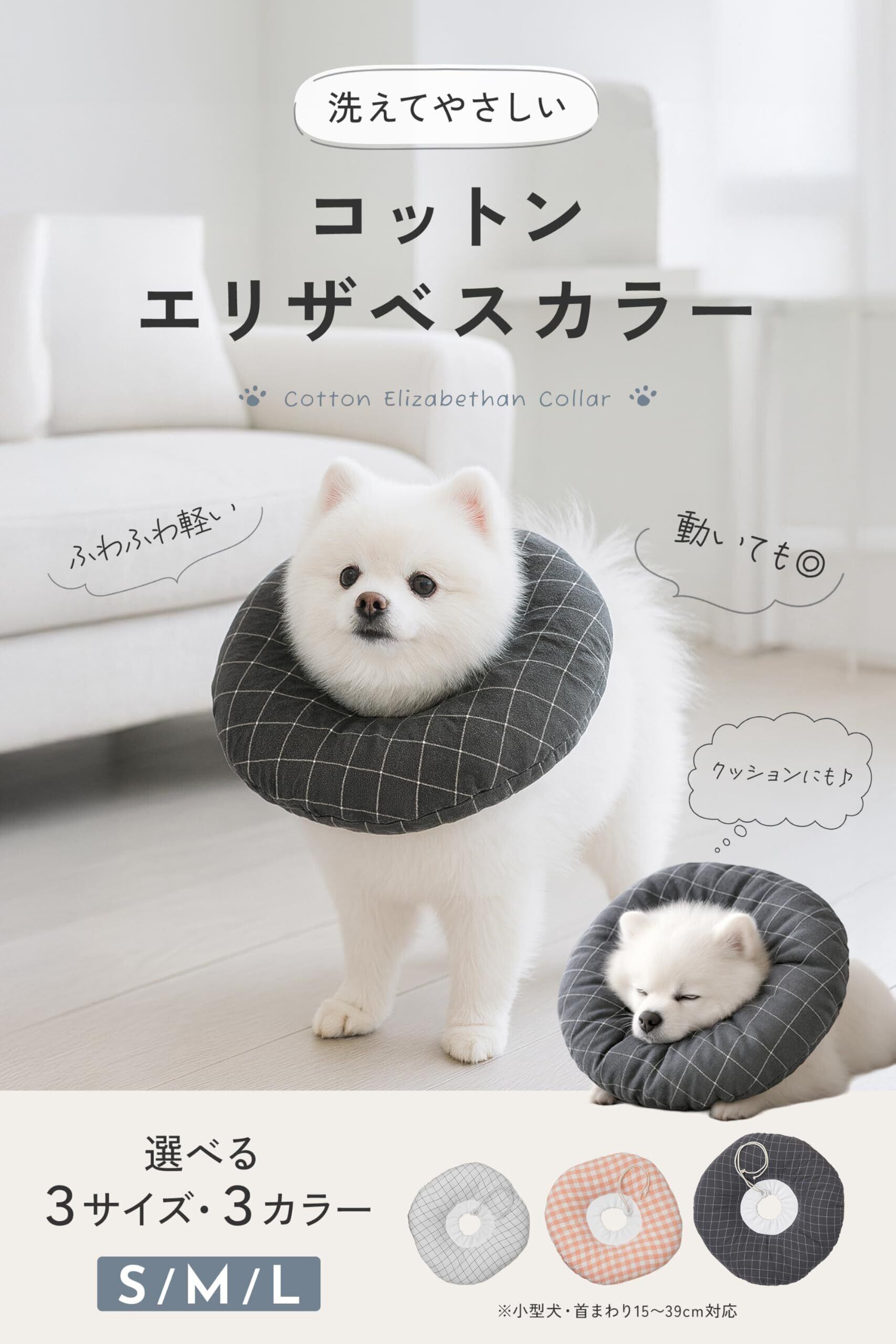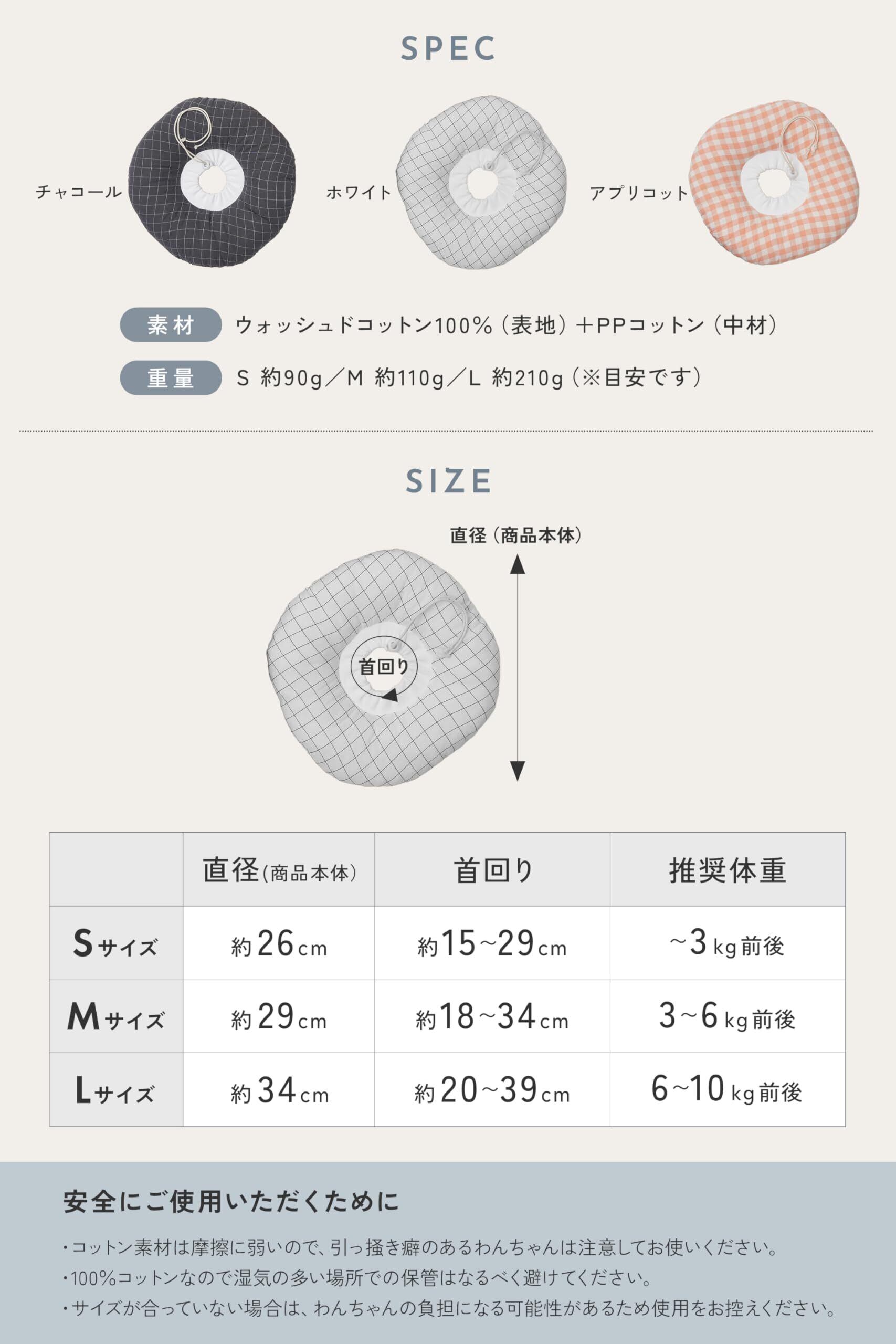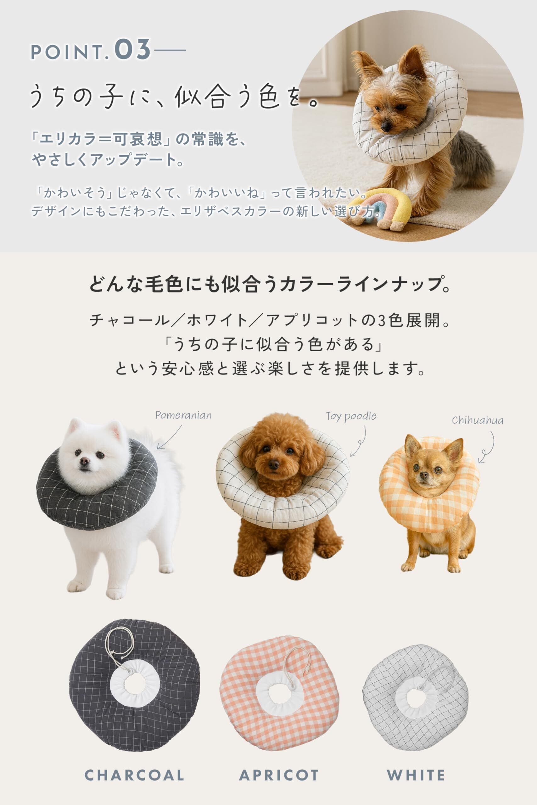 【カラー・サイズ展開】 カラーはチャコール/ホワイト/アプリコットの3色展開。サイズはS・M・Lの3サイズで、小型犬を中心に首まわり約15〜39cmまで対応します。体重や首回りに合わせて選びやすい設計です。