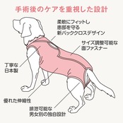 エリザベスカラーを卒業。もっと自由に、もっと快適に。 手術やケガ、トラブルがあるとき、触れられることがかえって我が子のストレスになることもあります。エリザベスウエアは、動きやすく締めつけない優しい設計で、傷口をそっと守ります。着せたまま排泄や通院もスムーズにでき、エリザベスカラーが苦手な子にも負担をかけません。 「カラーが可哀そう」「傷口を気にしていた」そんな声に応えた、獣医師さんと共同開発した我が子のための思いやりウェアです。
