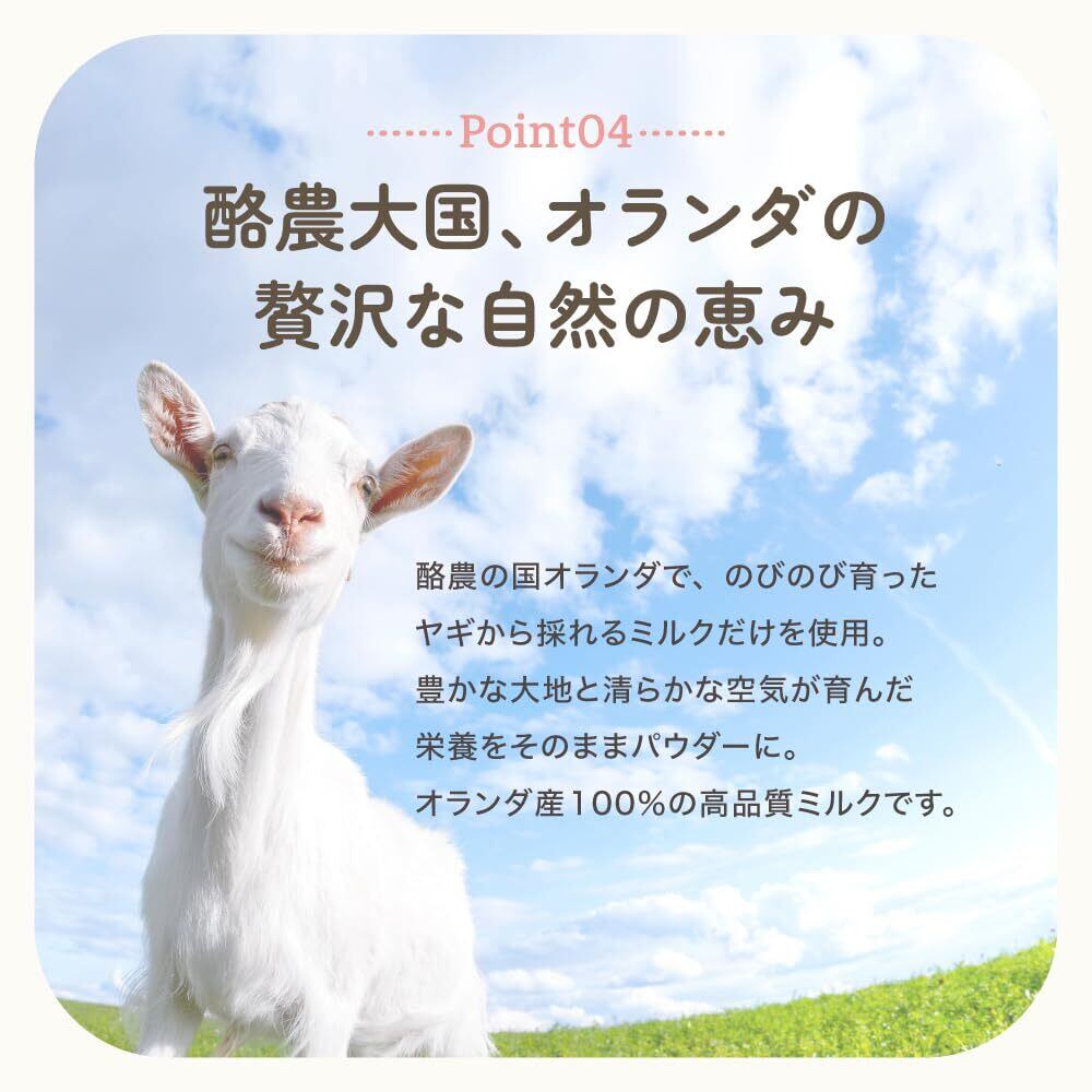 オランダ産100%のヤギミルク粉末使用 酪農大国であるオランダの豊かな大地に育まれた栄養たっぷりの粉末パウダーを使用しています。