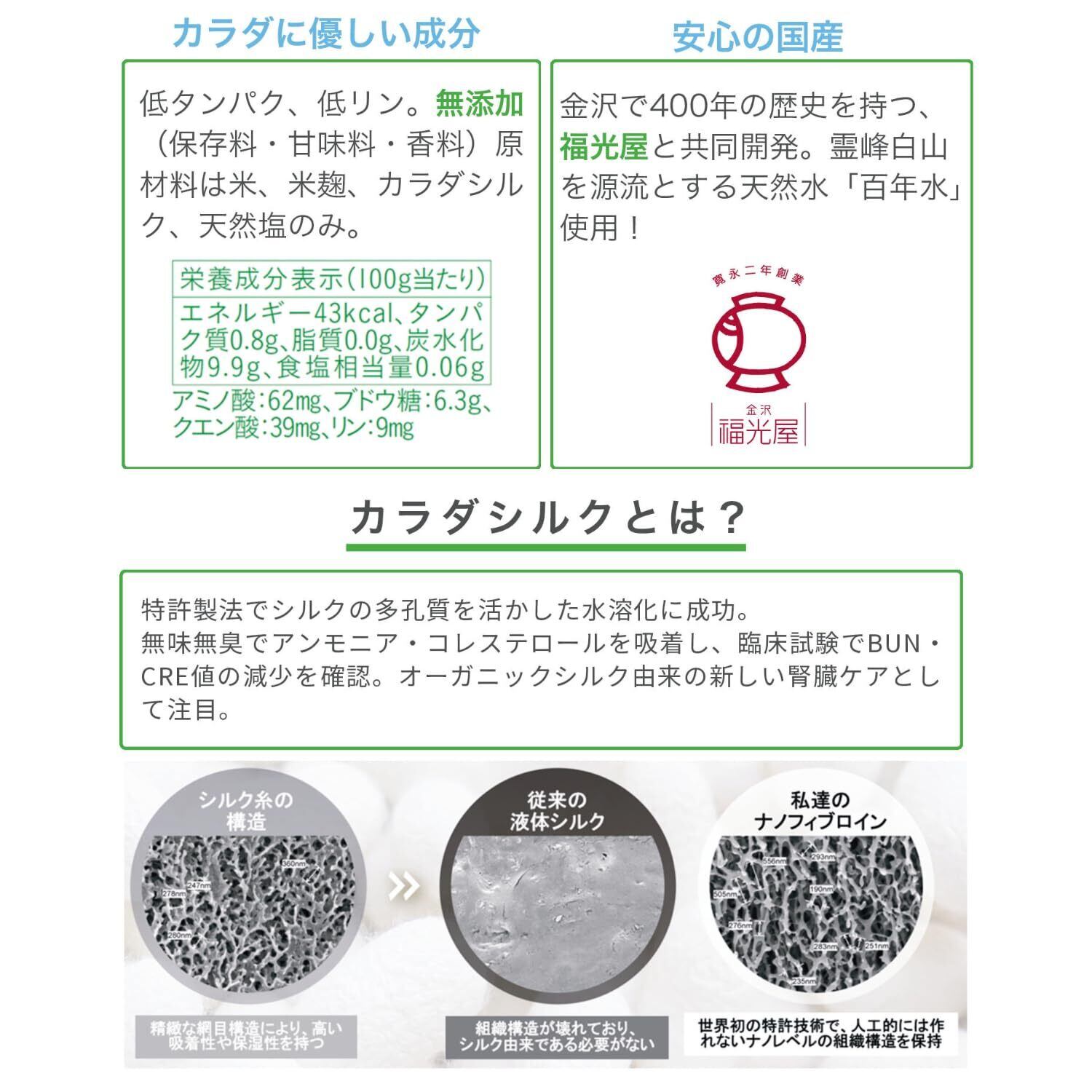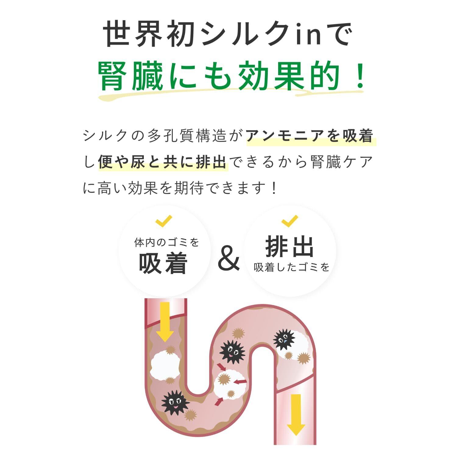 取得成分「カラダシルク」で腎臓ケア:天然のシルク由来成分「カラダシルク」が、体内のアンモニアを吸着し便や尿と共に排出。腎臓ケアにも配慮した設計です。
