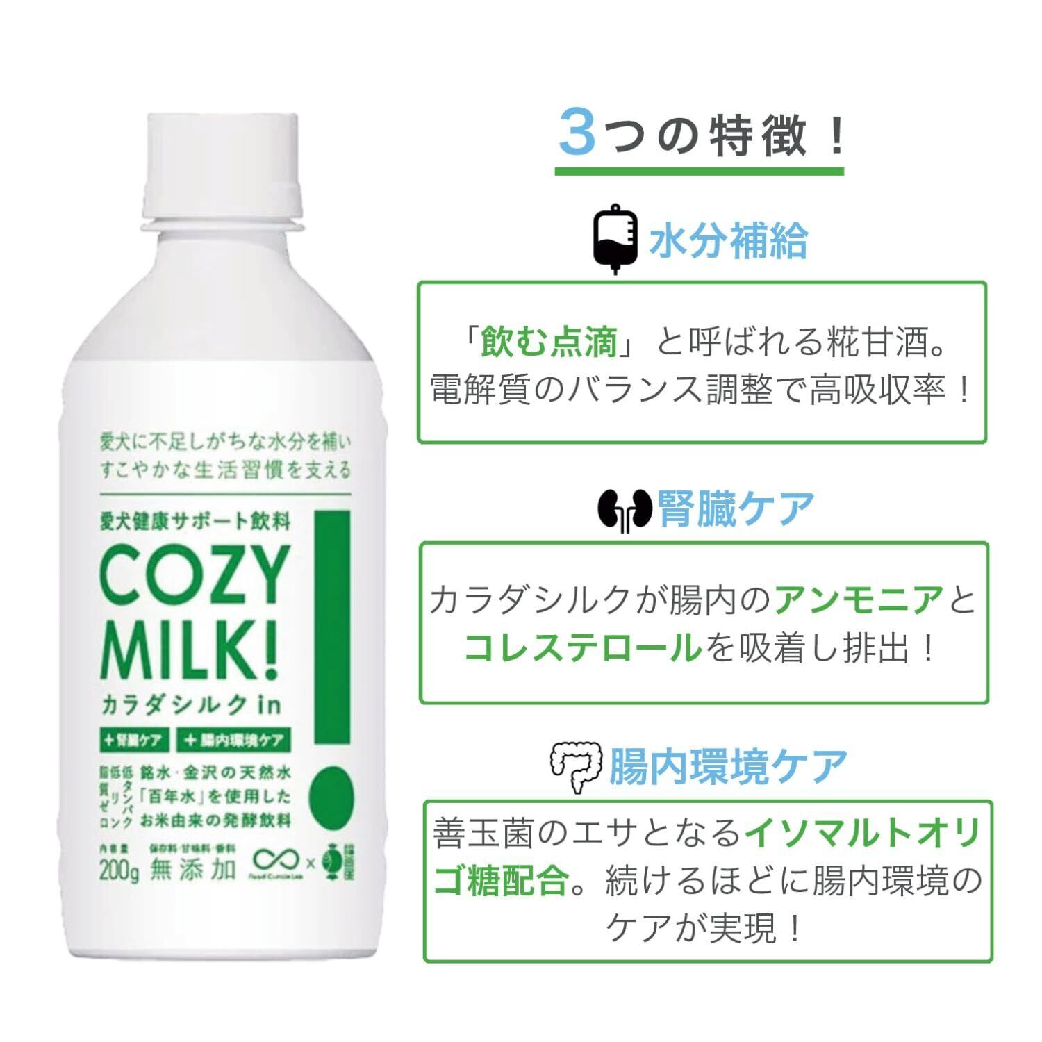 Cozy Milk コージーミルク 犬用健康サポート飲料 水分補給 栄養補給 熱中症対策 甘酒 腎臓 腎臓ケア 腎活 腸内環境 食物繊維 無添加 低カロリー 低タンパク 低リン ノンアルコール 食欲不振 カラダシルク シルク (200g×3本入り)