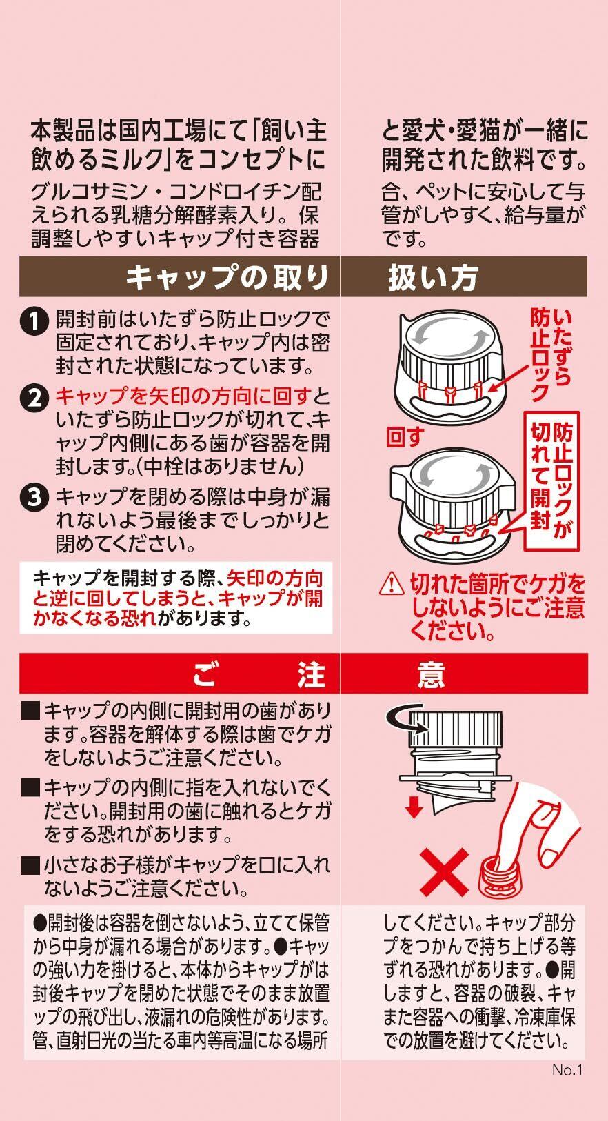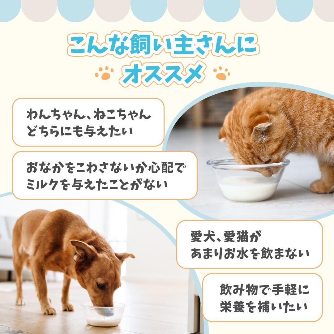 ・国内工場にて「飼い主と愛犬・愛猫が一緒に飲めるミルク」をコンセプトに開発された飲料です。 ・グルコサミン・コンドロイチン配合 ・ペットに安心して与えられる乳糖分解酵素入り。 ・保管がしやすく、給与量が調整しやすいキャップ付き容器です。