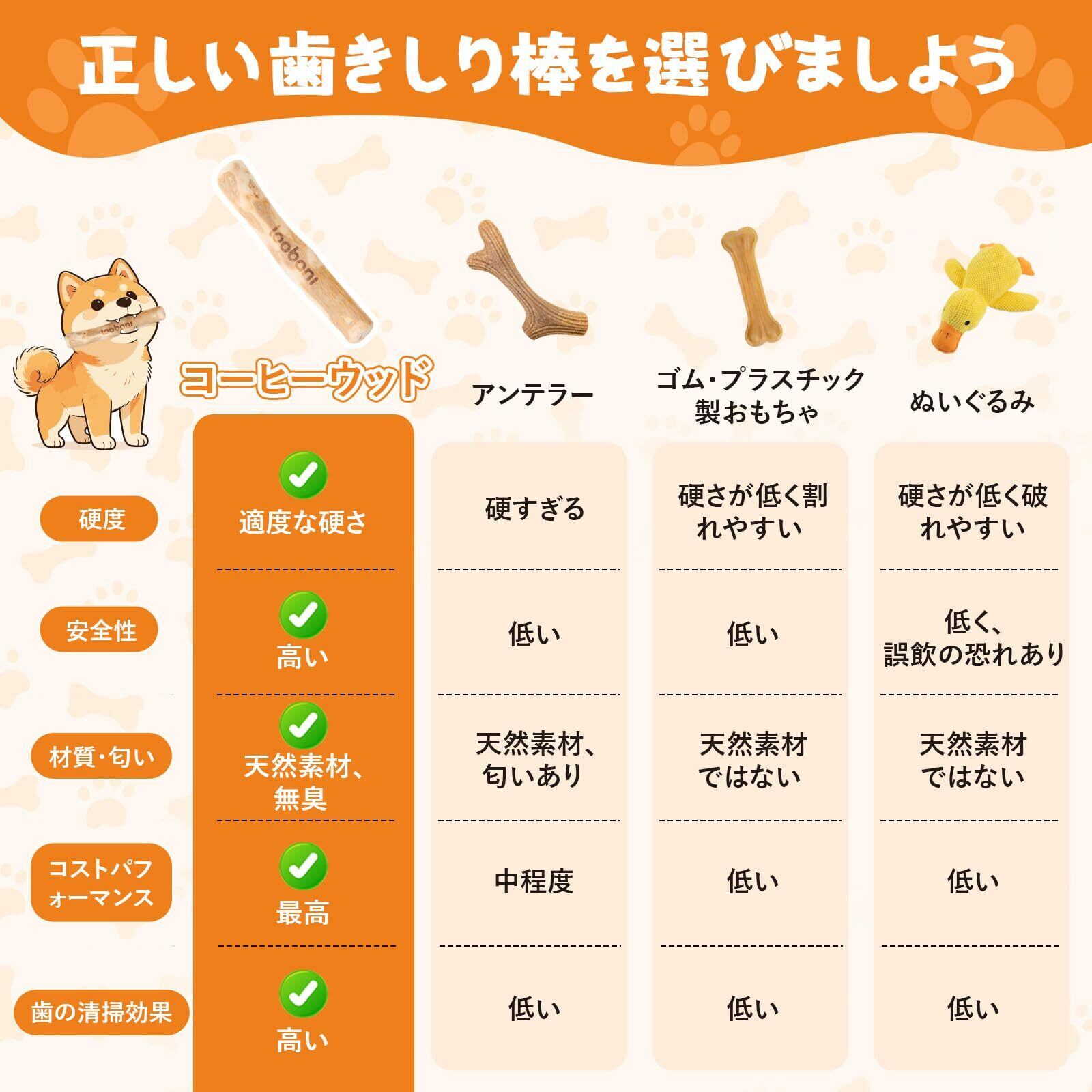 【持続性と耐久性抜群】:コーヒーウッドは硬く、繊維密度が高いため、犬にとって理想的な噛み心地です。壊れにくく、安全で耐久性があり、従来の製品の2倍の寿命を誇ります。鹿の角材に比べて適度な硬さがあり、歯の摩耗を防ぎます。ゴム製のおもちゃに比べて、天然素材なので安全で化学臭もありません。ぬいぐるみに比べて、コーヒーノキは飲み込まれにくく、汚れや細菌を吸着するため衛生的です。歯の清掃効果に優れ、便利で経済的です。