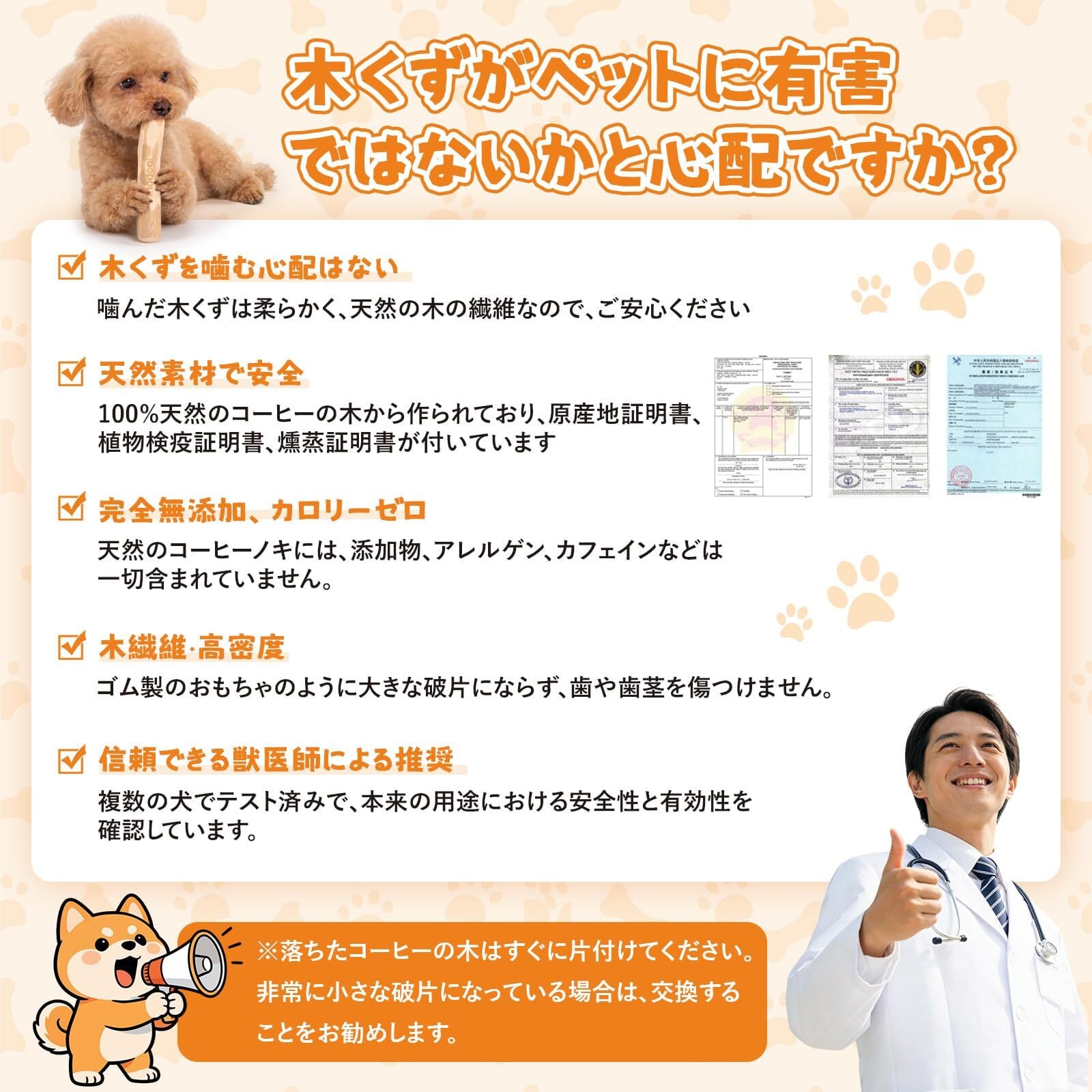 【木くずを噛む心配はない&信頼できる獣医師による推奨】:ペットが木くずを噛んで害を及ぼす心配はありません。犬 おもちゃ 噛むは100%天然のコーヒーノキから作られており、添加物、アレルゲン、カフェインは一切含まれておらず、原産地証明書と検疫証明書も完備しています。高密度の木繊維は柔らかく、大きな破片になりにくいため、歯と歯茎を効果的に保護します。専門の獣医師にも推奨されており、安全性は実証済みです。万が一、木くずが飛び散った場合は、速やかに片付け、破片が小さくなりすぎた場合は新しい製品と交換してください。