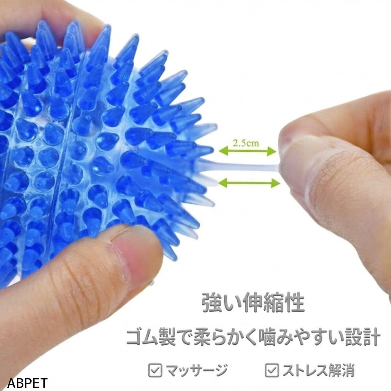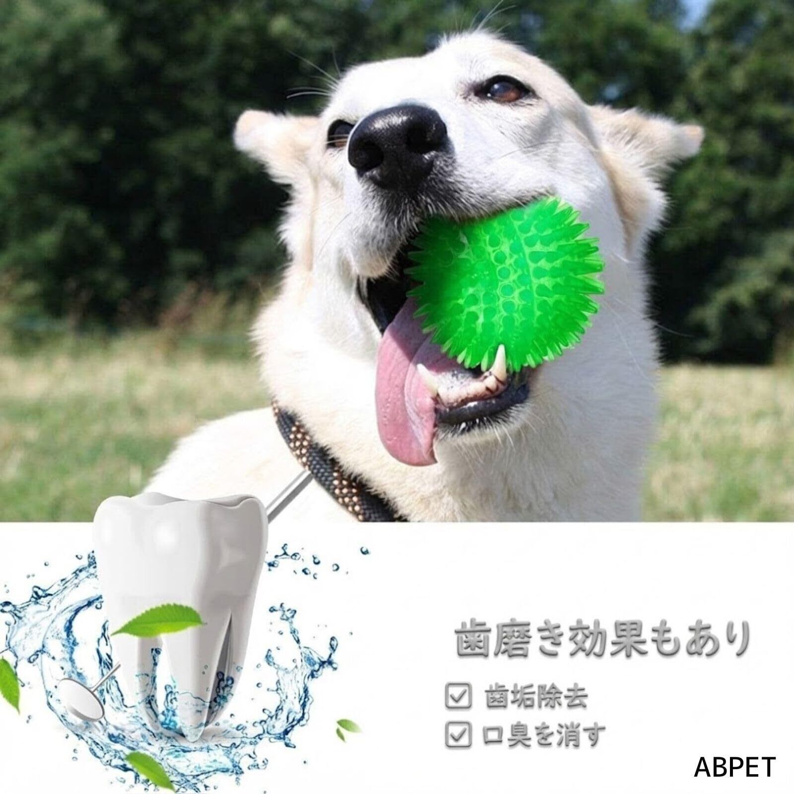 製品詳細:本体サイズはSサイズ(直径6.5cm)とMサイズ(直径9cm)の2種類、カラーはグリーン・ブルー・オレンジの3色セットです。小型犬から中型犬まで使いやすく、遊びながら歯のケアができます。かわいらしいデザインで、ペットの興味を引きやすい形状です。