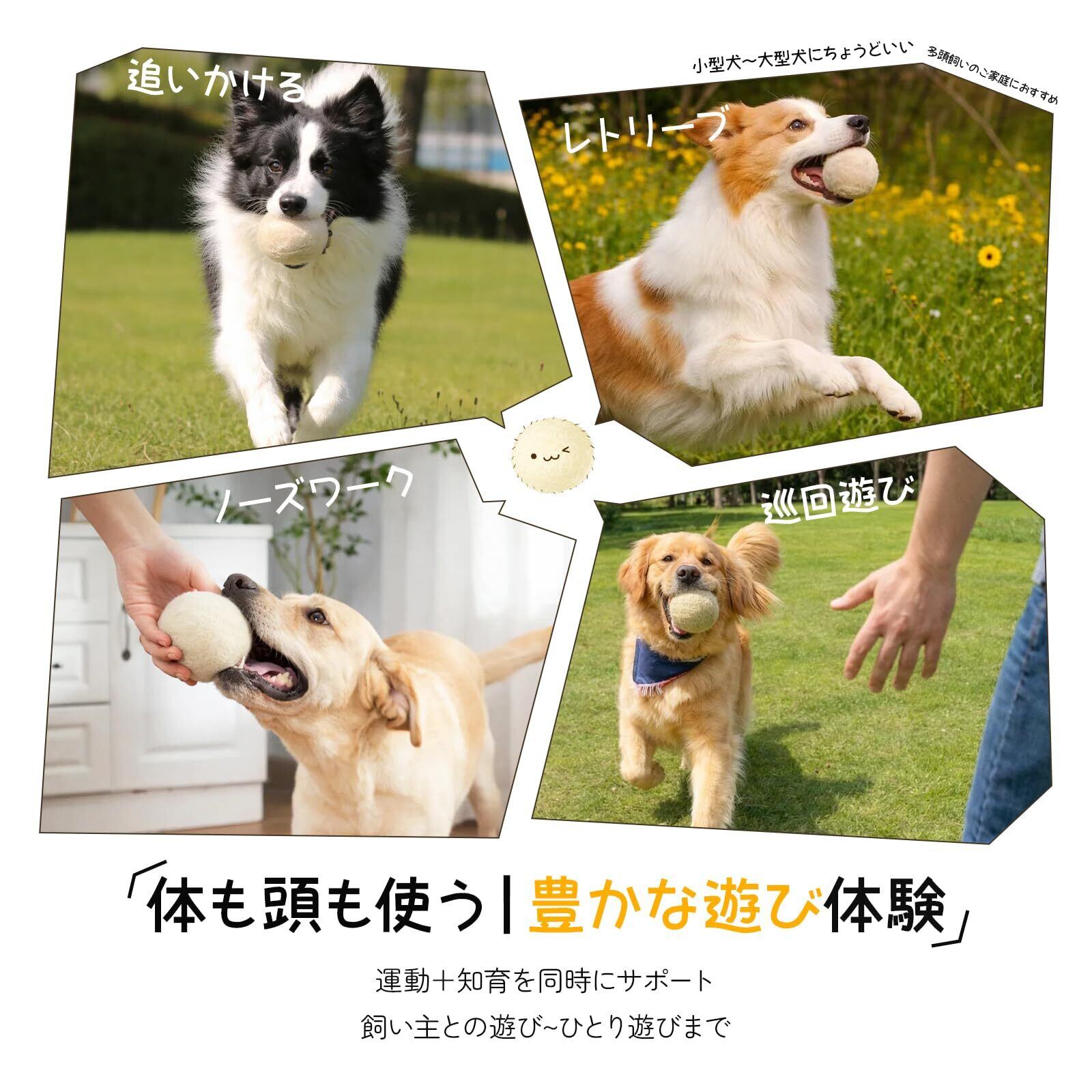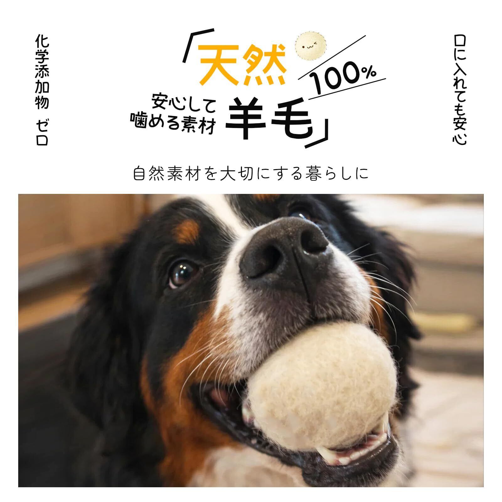 【天然羊毛100%|安心してカミカミできる】 天然羊毛のみを使用した犬用ウールボール。化学添加物を使わず、噛んだりくわえたりしても安心な素材で、口に入れることの多い愛犬にもやさしい設計です。ナチュラル志向の飼い主さんにも選ばれています。