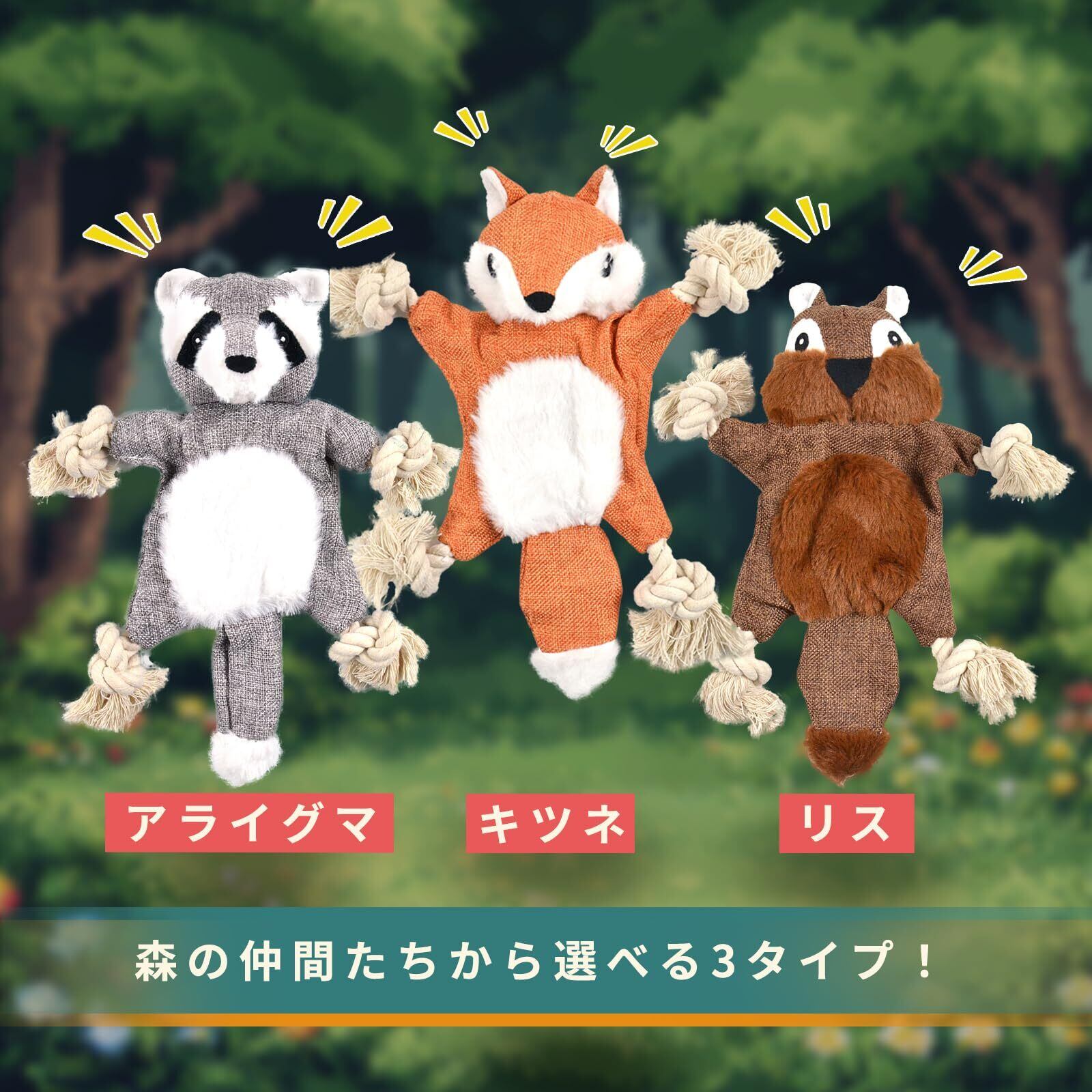 【可愛い森の仲間デザイン&様々な犬種に対応】リス・キツネ・アライグマをモチーフにした愛らしいぬいぐるみデザイン。横幅約25cm・高さ約30cmで、小型犬・中型犬・大型犬まで幅広く対応。見た目も機能性も兼ね備えた知育おもちゃです。