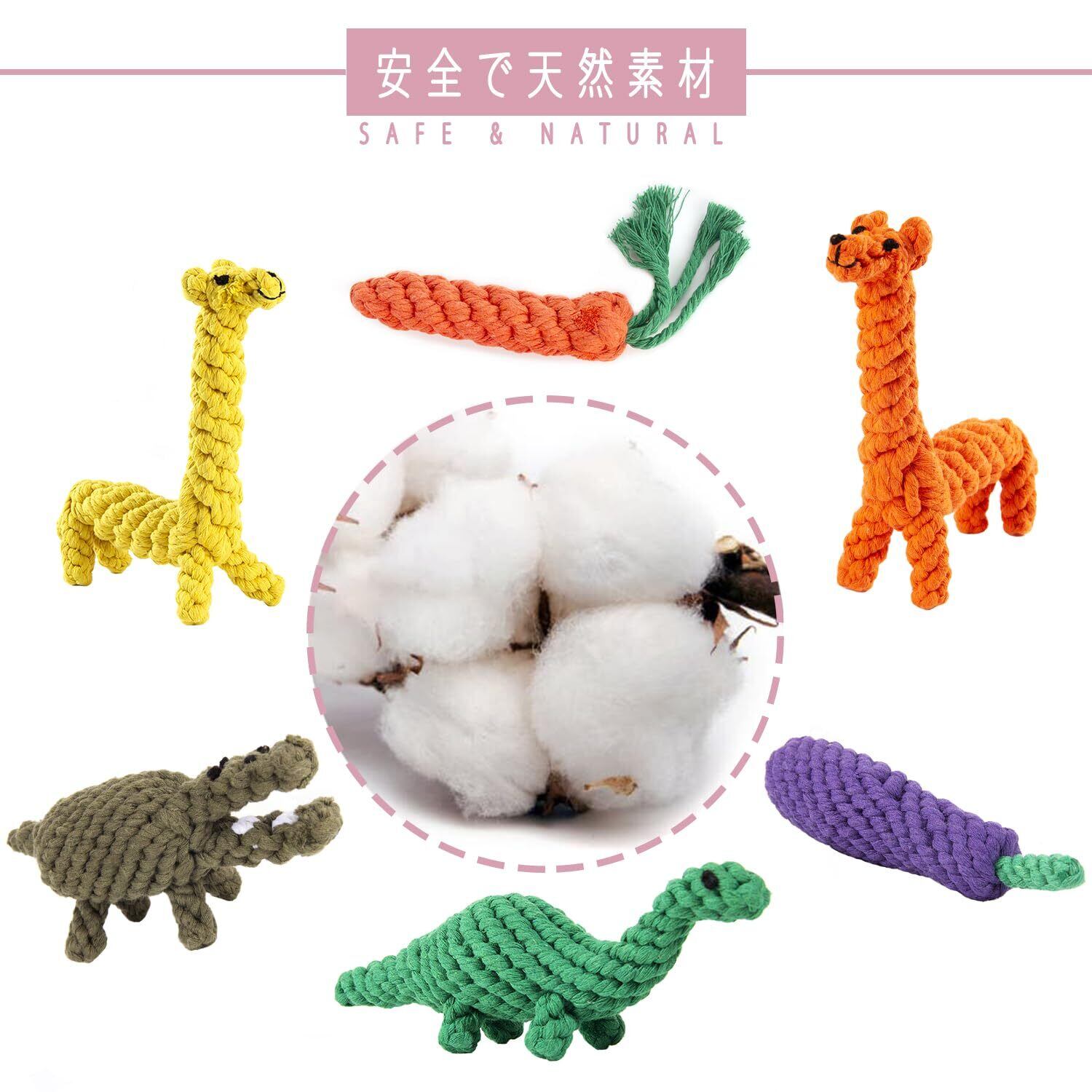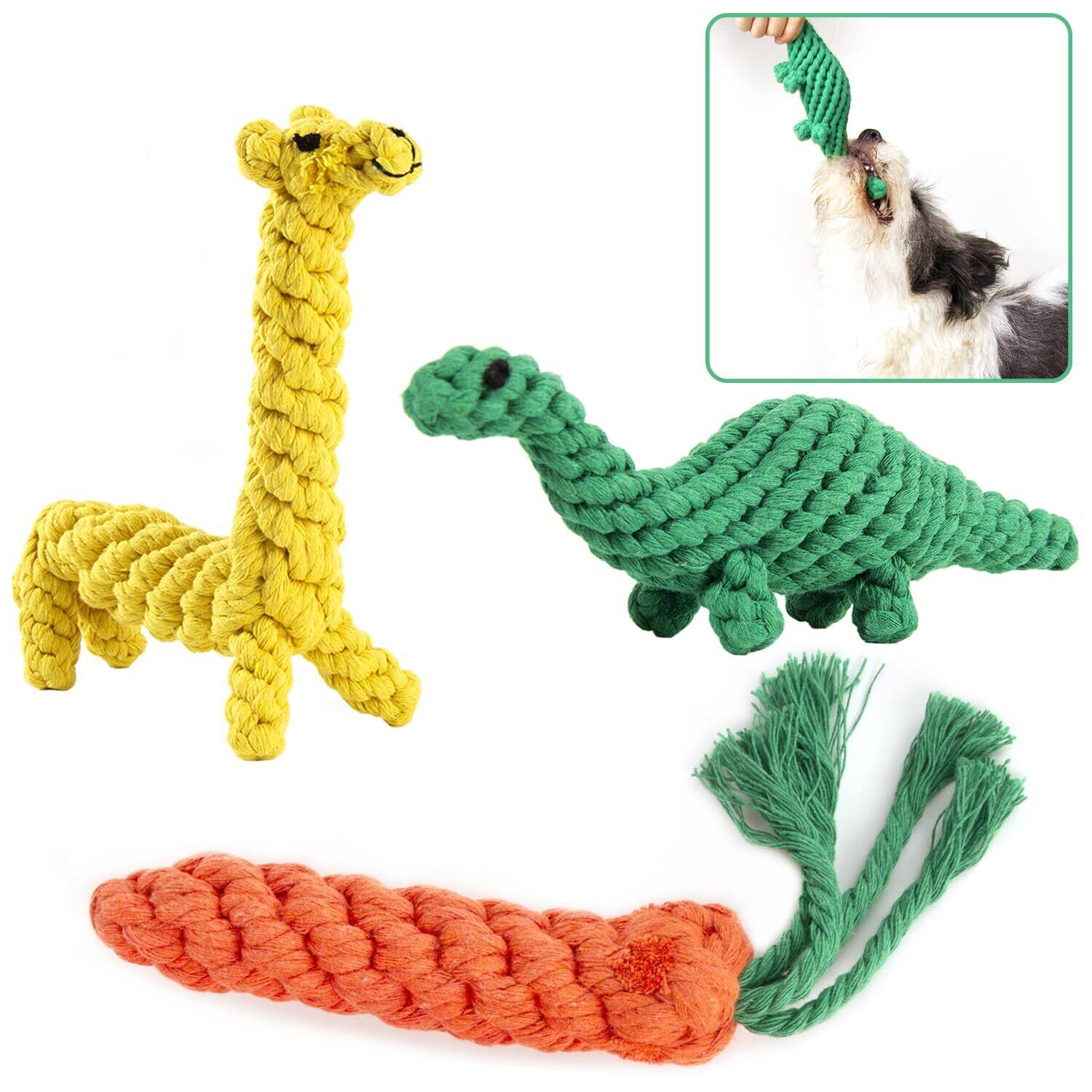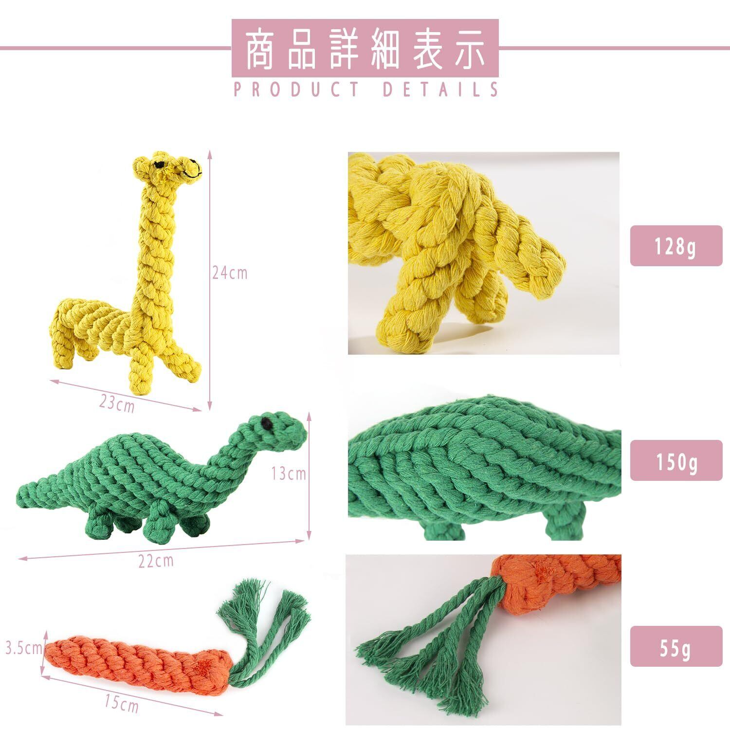 【100%綿素材】:手作りで多色の動物モチーフが編み込まれた、歯ぎしりやお供のペットのおもちゃです。緑色のティラノサウルス、黄色のキリン、オレンジ色のトラ、紫のナス、軍緑色のカバなど、屋外で投げたり、屋内でインタラクティブに遊べるおもちゃとして、あなたと愛犬との絆を強化します。インタラクティブな遊びは、犬とのコミュニケーションを深め、幸せで健康な生活をサポートします。