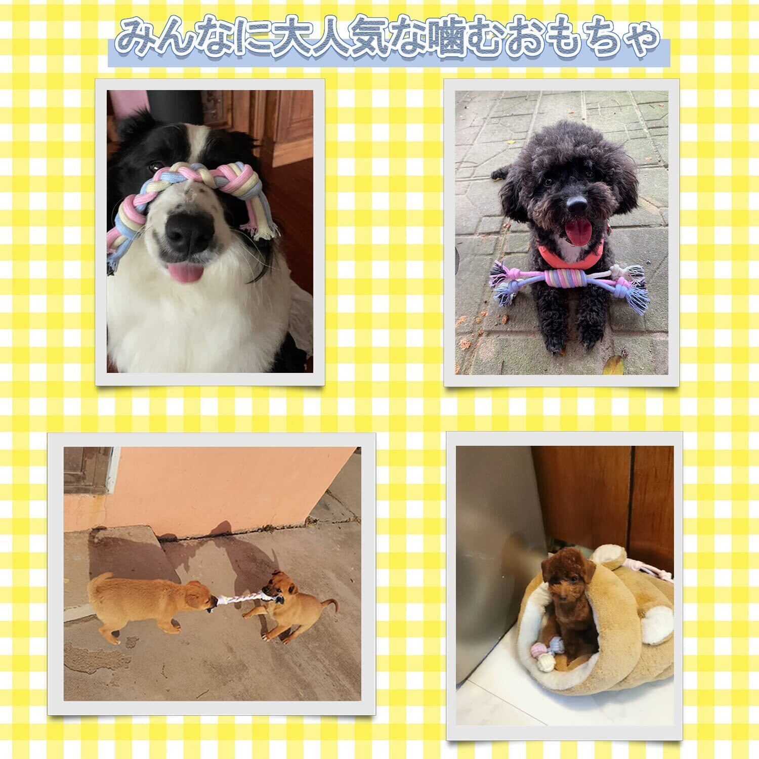 【こんな場面で活躍】ロープおもちゃはカミカミしたり引っ張り合いっこができるので、愛犬の狩猟本能が刺激されて、楽しく遊んでくれます。(三つ編形状のロープは伸縮性がややあり、ひっぱりっこに最適。)ボリューム感のある編み込みで奥まで歯がしっかりはいって、噛むことで歯垢が落ちやすいので、歯磨き効果や歯茎マッサージ効果が期待でき、口腔内の健康維持に役立ちます。歯の生え変わりで、何でも噛みたいむずむずする時期の子犬のストレス解消にもおすすめ。飼い主さんと引っ張り合いっこしてコミュニケーションおもちゃとしても!お家にこもる日に運動不足のワンちゃんが元気いっぱい遊べます!
