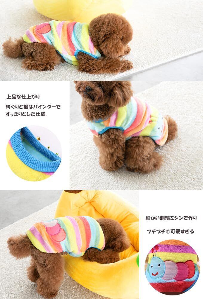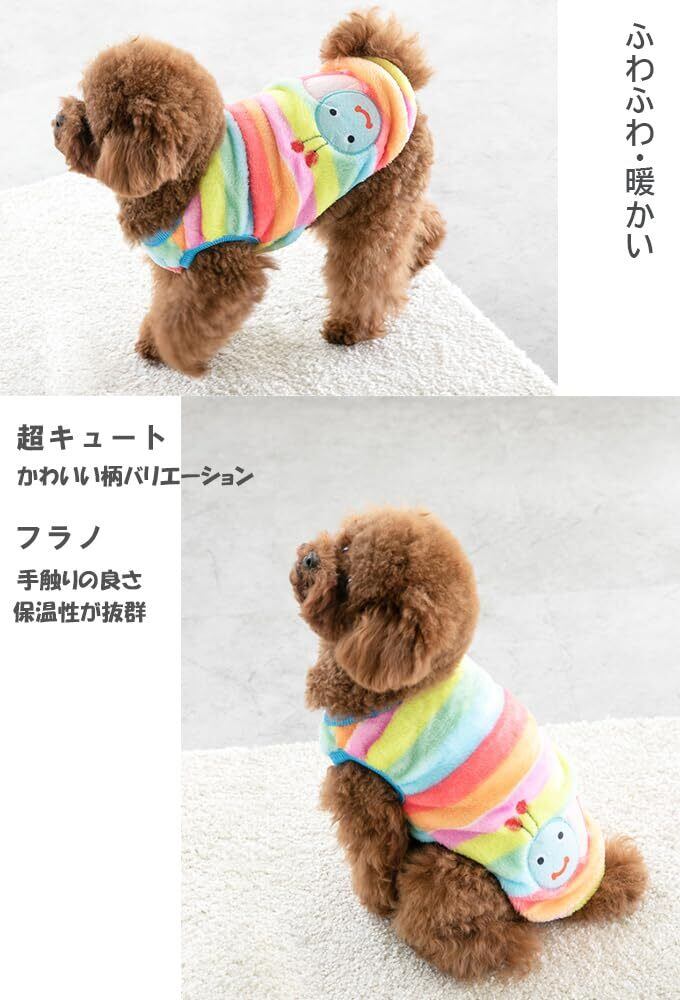 【材質】ポリエステル。保温性あり伸縮性のある綿混素材、ワンちゃんや猫ちゃんペット用のタンク。防寒、抜け毛防止、部屋着、パジャマとしても活用されています。ボアなフリースですので、秋や冬シーズンに活躍してくれます。ふわふわモコモコの可愛いペット用ふりーすです。背中のイラストがとってもキュート。柔らかな素材と温かみのある色合いで秋冬ウェアにおすすめ。
