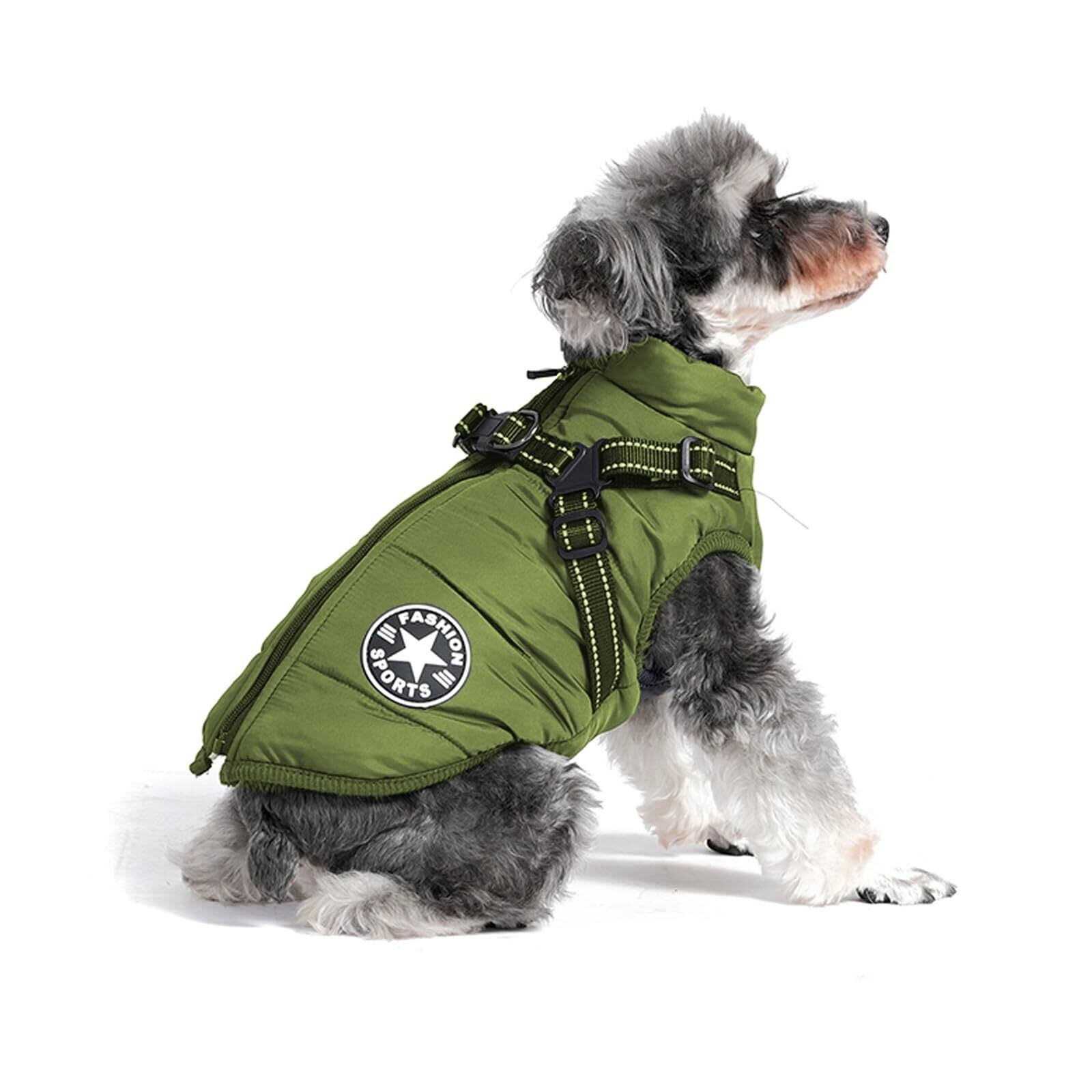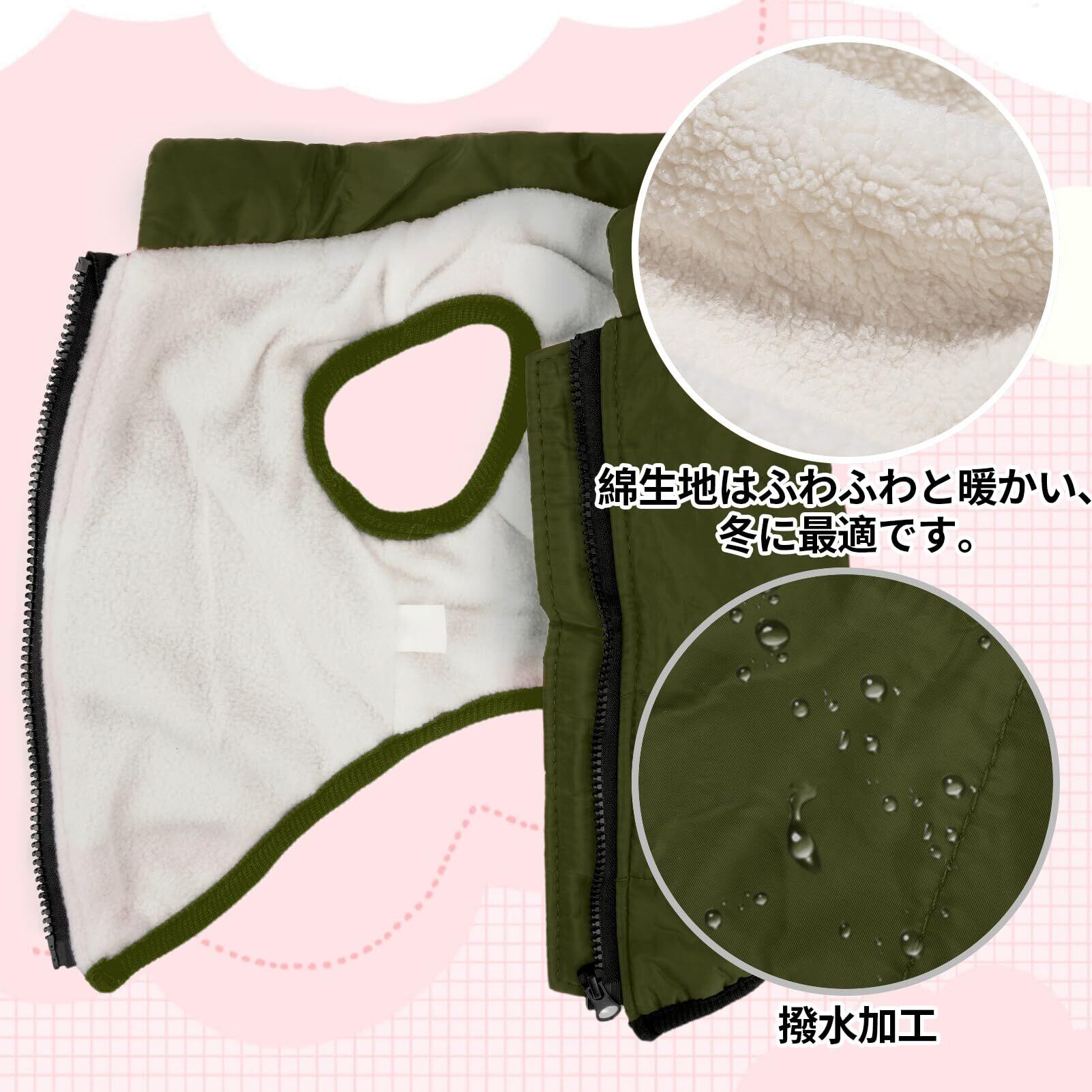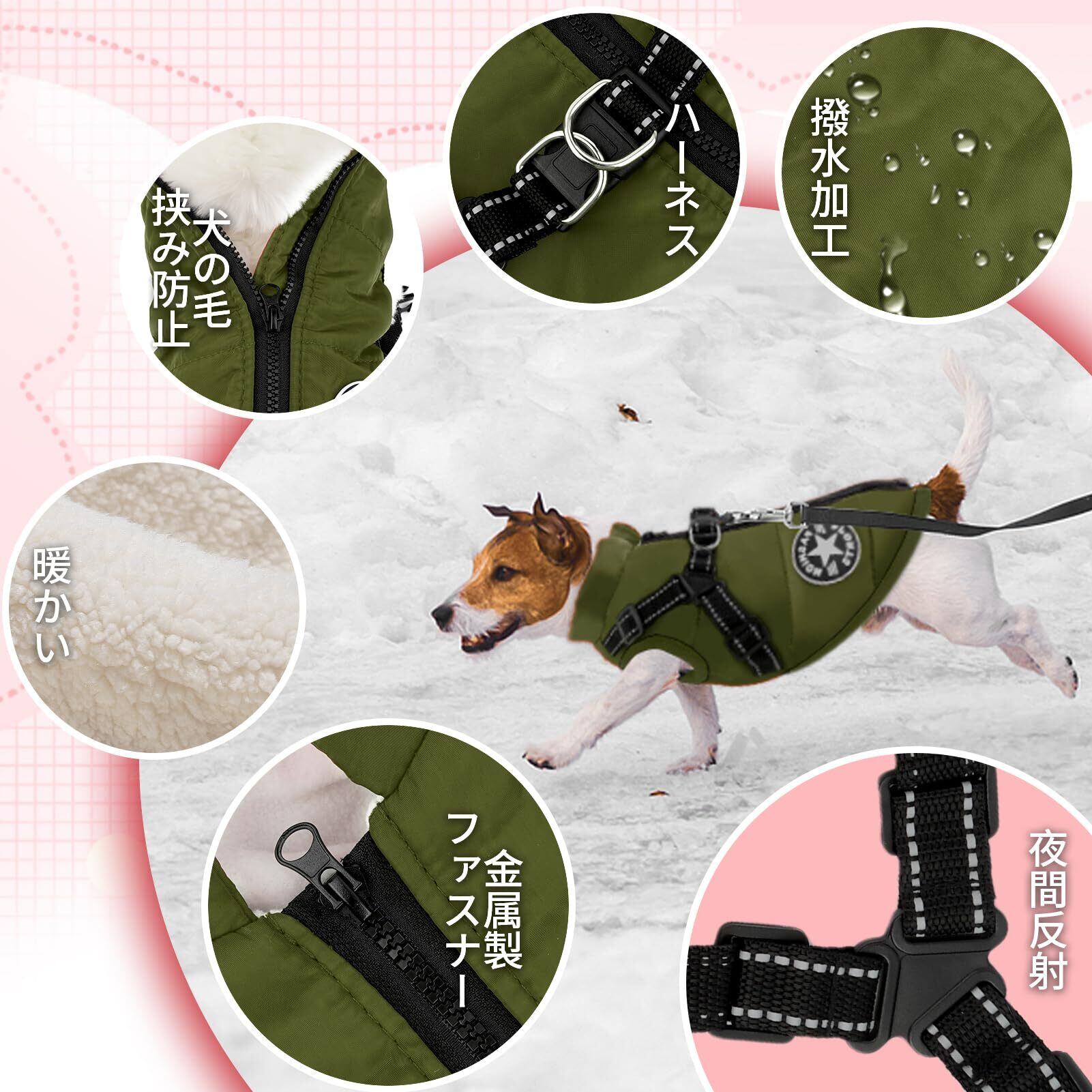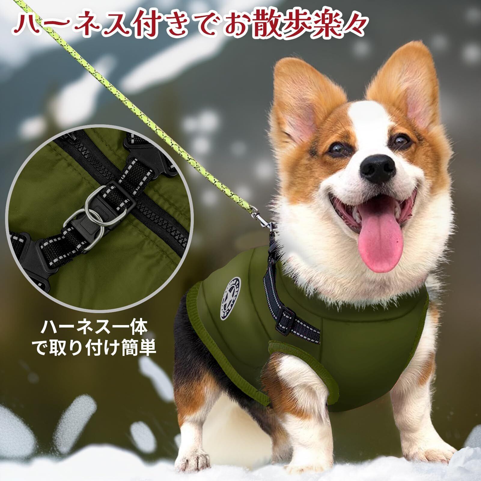 Koramaku 犬服 一体型綿コート ハーネス付き 背中開き おしゃれ 牽引 夜間反射 暖かい ペット 猫 犬 服 冬 小型犬 中型犬 着脱簡単 裏起毛 ベスト 防寒 防水 撥水 ジャケットリードリングあり お散歩(L,オリブ-)