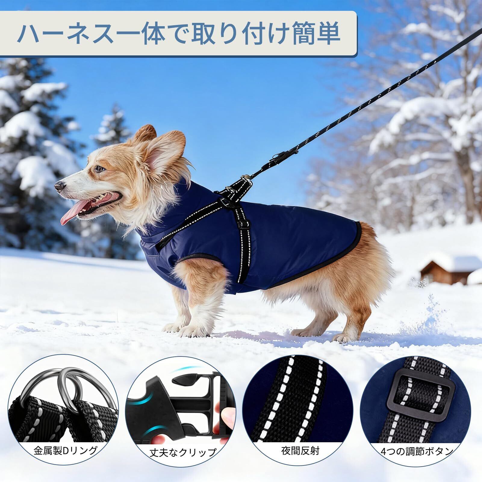 Anzentakai 犬服 冬【2025年冬の登場】軽量 綿服コート ハーネス付き 背中開き おしゃれ 牽引 夜間反射 暖かい ペット 猫 犬 服 冬 着脱簡単 裏起毛 犬の服 ベスト 防寒 防水 撥水 ジャケット リードリングあり 小型犬 中型犬 大型犬 お散歩(青,5XL)