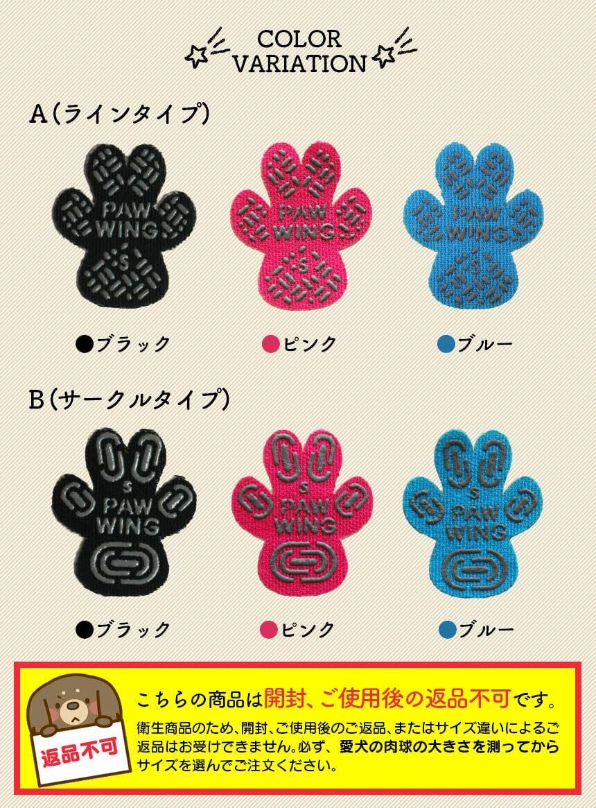 PAW WINGから、かわいくてグリップ力がアップしたモデルが新登場!ペット用すべり止めフットパッドPAW WINGの新モデルです。スニーカーのアウトソールや肉球をイメージしたかわいいデザインは、すべり止めの面も従来より大きくなり、グリップ力がさらにプラスされました。足裏にペタッと貼るだけで、まるで翼が生えたようなスムーズな歩みをサポートしてくれます。A(ライン);縞板柄のすべり止めをほどこした、スニーカーのアウトソールのようなデザインです。B(サークル):肉球をイメージした、楕円形のすべり止めをほどこしたデザインです。