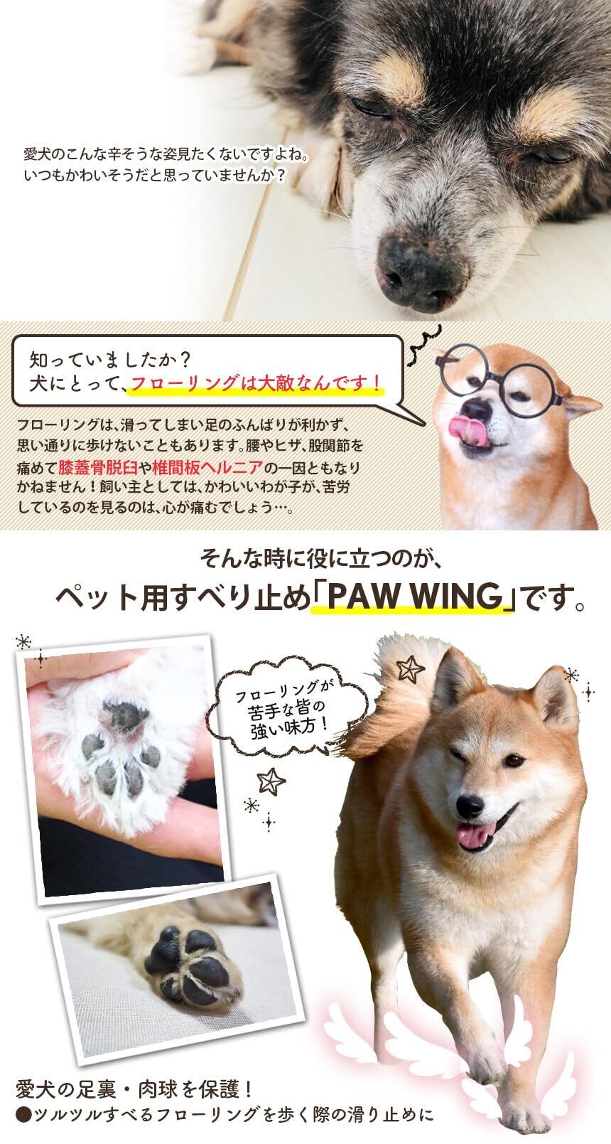 【知っていましたか?犬にとって、フローリングは天敵なんです!】フローリングは、滑ってしまい足のふんばりが利かず、思い通りに歩けないこともあります。腰やヒザ、股関節を痛めて膝蓋骨脱臼や椎間板ヘルニア一因ともなりかねません!飼い主としては、可愛い我が子が、苦労しているのを見るのは心が痛みます…。 【専用シューズやカーペットもあるけれど…】フローリングの滑り止め対策として、ペット用シューズやカーペット、専用フローリングなどの選択肢はありますが、専用シューズや靴下を使っても…ペットが嫌がって脱いでしまう。暴れてしまって、履かせるだけでひと苦労!カーペットを敷いても…カーペットは愛犬が遊んで、ぐちゃぐちゃにしてしまう。。。思い切って専用のフローリングにすると…大切なペットのためとはいえ、全室ペット専用フローリングを敷こうとすると費用が高い!!などなど、悩みも多いですよね。そんなお困りの飼い主さんにオススメなのが、ワンちゃんの肉球に貼るだけOKの「PAW WING」なんです!