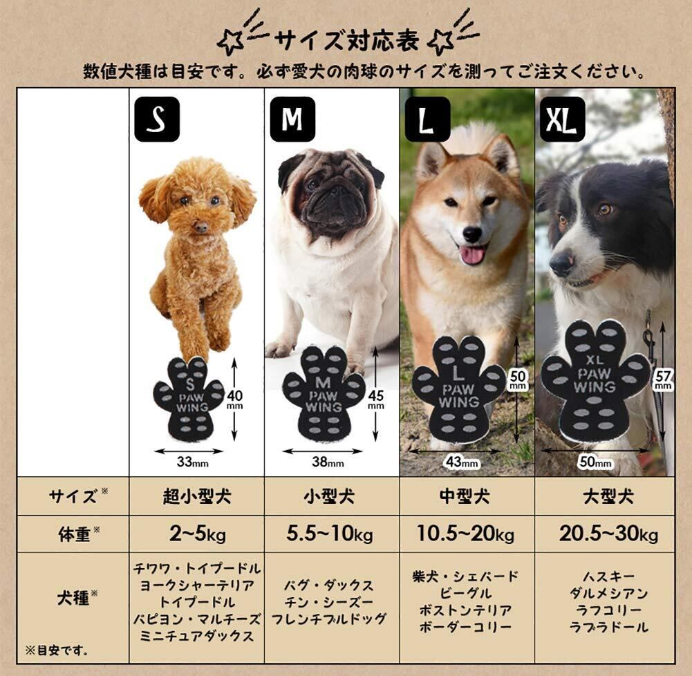 選べる4つのサイズ!犬種にあわせてサイズをお選びください。数値・犬種は目安です。必ず愛犬の肉球のサイズを測ってご注文ください。 【Sサイズ】超小型犬:体重2~5kg チワワ・トイプードル・ヨークシャーテリア・パピヨン・マルチーズ・ミニチュアダックス【Mサイズ】小型犬 :体重5.5~10kg パグ・ダックス・チン・シーズー・フレンチブルドッグ【Lサイズ】中型犬 :体重10.5~20kg 柴犬・シェパード・ビーグル・ボストンテリア・ボーダーコリー【XLサイズ】大型犬 :体重20.5~30kg ハスキー・ダルメシアン・ラフコリー・ラブラドール