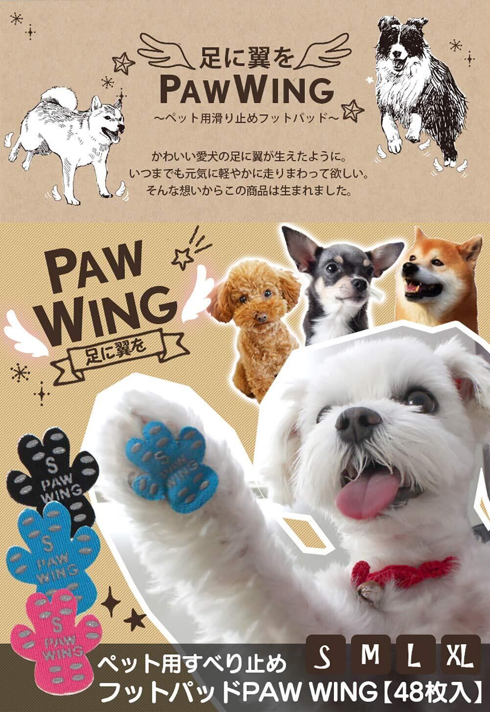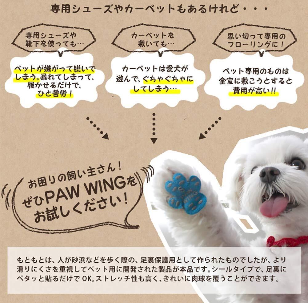 肉球にぺたっと貼るだけ!ツルツルすべるフローリングもスイスイ歩けます!もともとは、人が砂浜などを歩く際の足裏保護用として作られたものでしたが、より滑りにくさを重視して、ペット用に開発された製品がこのPAW WING(パウウイング)です。シールタイプですので、足裏にペタッと貼るだけでOKです。シールのストレッチ性(伸縮性)も高いので、きれいに肉球を覆うことができます。シリコン製の滑り止めでしっかりとフローリングをつかみ、まるで土の上を歩いているように歩けます。装着する前は、滑って転倒ばかりしていたのに、まるで羽が生えたかのようにスムーズに歩けます。ストレッチ性が高い繊維を使用しているので柔らかい肉球をしっかり覆って保護できるように、ストレッチ性の高い繊維を使用して作られています。刺激の少ない、安心な粘着剤を使用しています。デリケートな部分に触れる物ですので、粘着剤は刺激の少ないスキンフレンドリー粘着剤を使用しています。剥離紙には当社独自のスリットが入っているので、絆創膏のように剥がしやすく使いやすい!