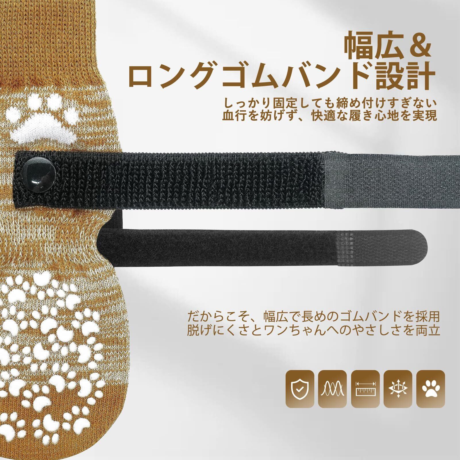 【サイズ】Size XXS: 足幅 約3.5cm、長さ 約10cm。Size XS: 足幅 約4.6cm、長さ 約11.2cm。Size S: 足幅 約5.3cm、長さ 約13.5cm。Size M: 足幅 約6.5cm、長さ 約16cm。Size L: 足幅 約7.6cm、長さ 約18.3cm。Size XL: 足幅 約8.9cm、長さ 約20cm。Size XXL: 足幅 約10cm、長さ 約22.6cm。ご購入前に必ずワンちゃんの足のサイズを測定してください。もしサイズが2つの中間で迷われた場合は、小さめのサイズをお選びいただくのがおすすめです。生地には伸縮性があるため、快適にフィットします。複数のサイズ展開があり、シニア犬や怪我・病気のある犬、室内飼いの小型犬から活発な中〜大型犬まで、幅広い犬種に対応可能。