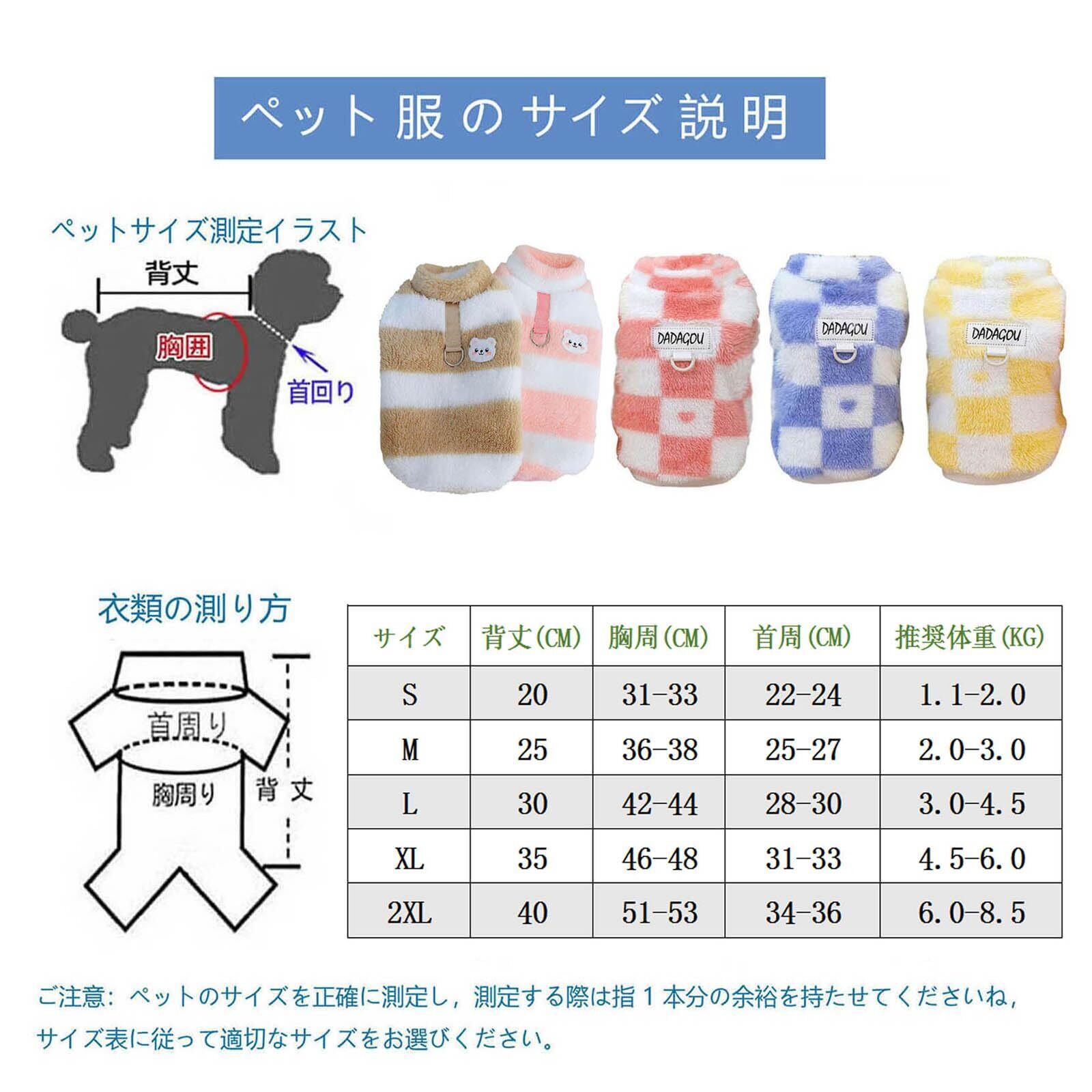 サイズ: S バック長約20cm バスト約32cm 首回り23cm; M バック長約25cm バスト約37cm 首回り26cm; L バック長約30cm バスト約43cm 首回り29cm; XL バック長約35cm バスト約47cm 首回り32cm; 2XL バック長約40cm バスト約52cm 首回り35cm。