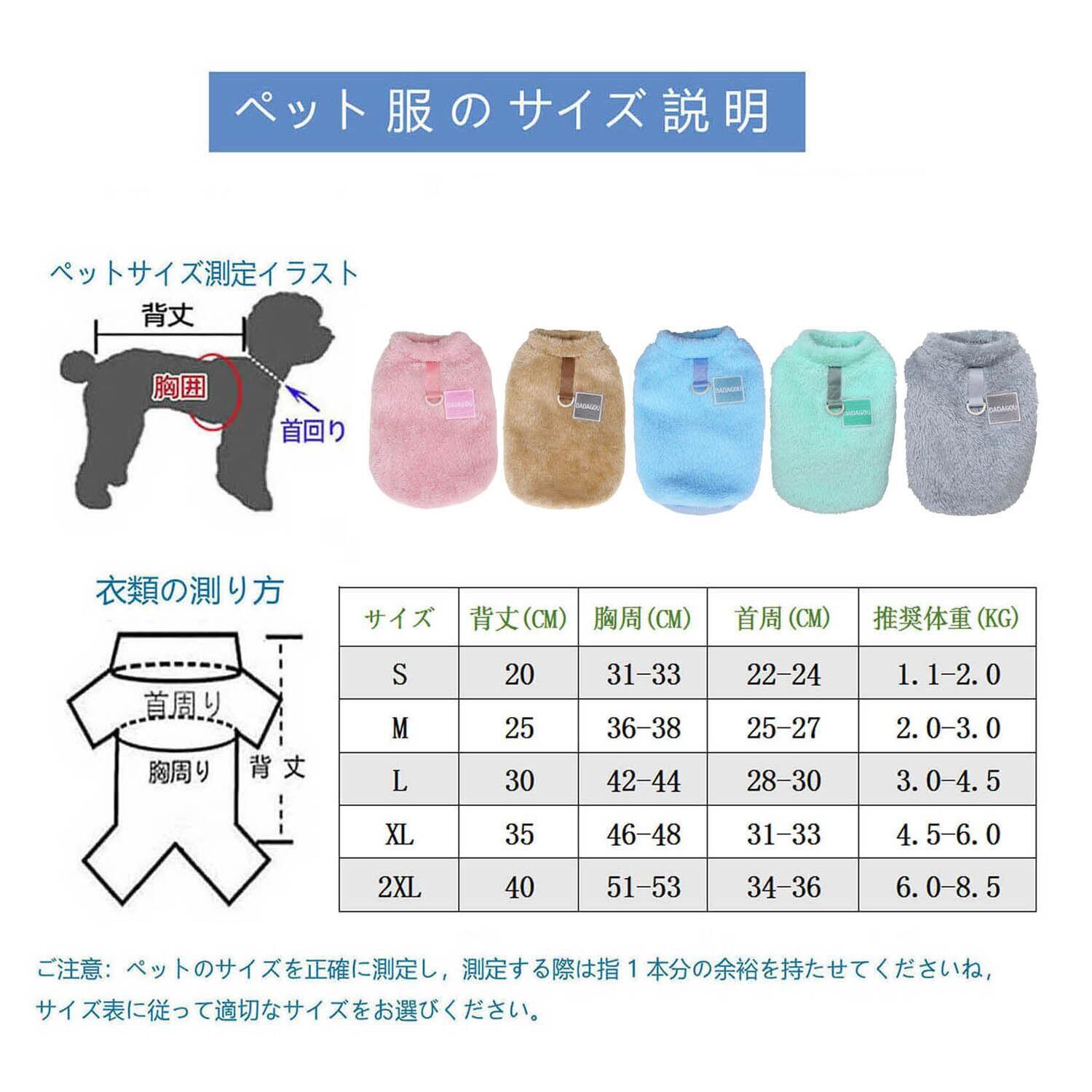 サイズ: S バック長約20cm バスト約32cm 首回り23cm; M バック長約25cm バスト約37cm 首回り26cm; L バック長約30cm バスト約42cm 首回り29cm; XL バック長約35cm バスト約47cm 首回り32cm; 2XL バック長約40cm バスト約52cm 首回り35cm。