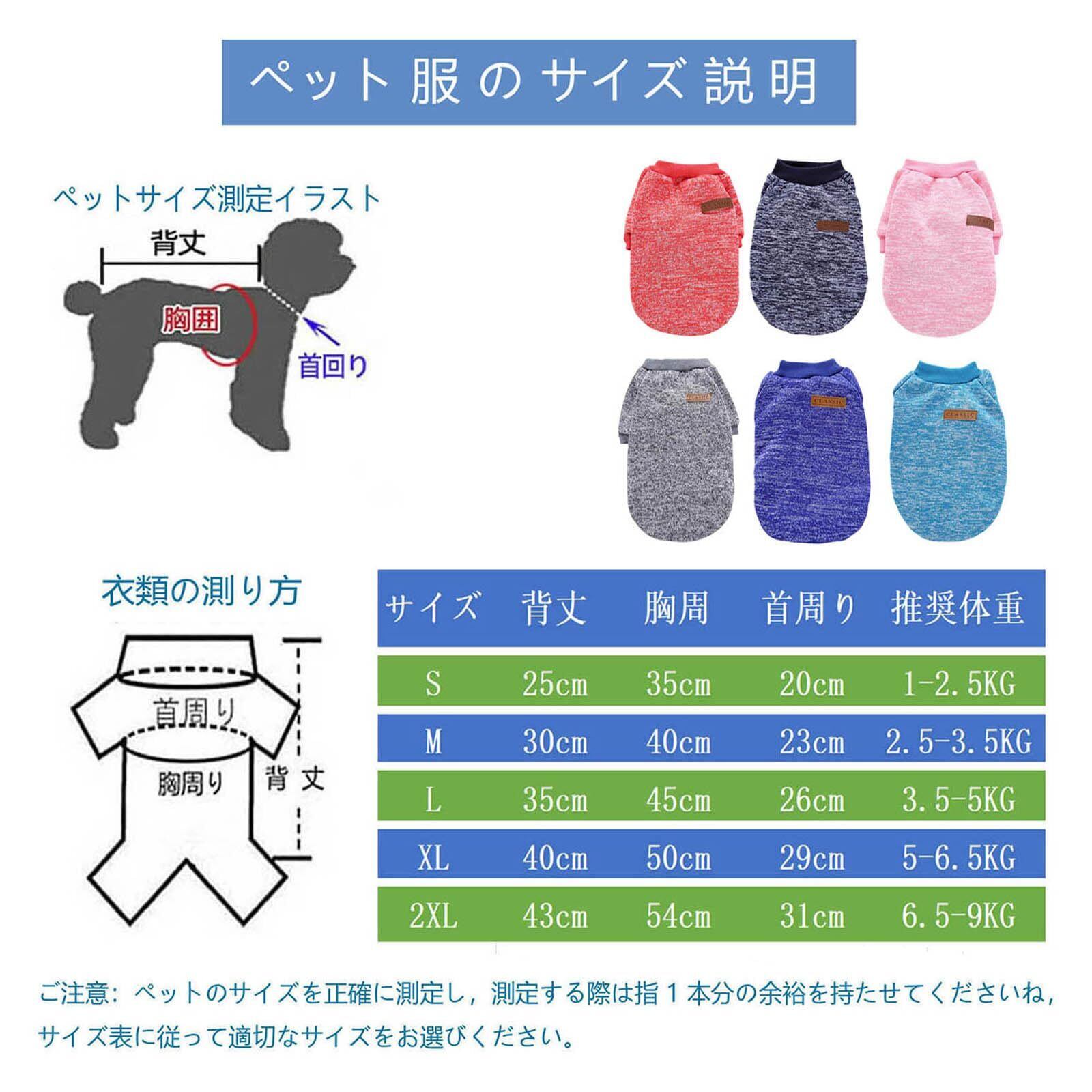 サイズ: S バック長約25cm バスト約35cm 首回り21cm; M バック長約30cm バスト約40cm 首回り24cm; L バック長約35cm バスト約45cm 首回り27cm; XL バック長約40cm バスト約50cm 首回り30cm; 2XL バック長約43cm バスト約54cm 首回り33cm。ニットの伸縮性のあるリブ襟元デザイン。