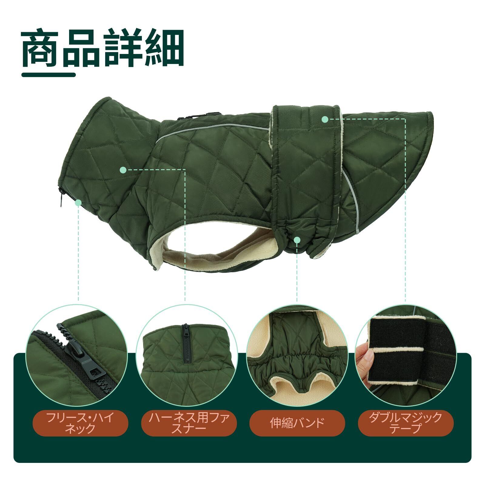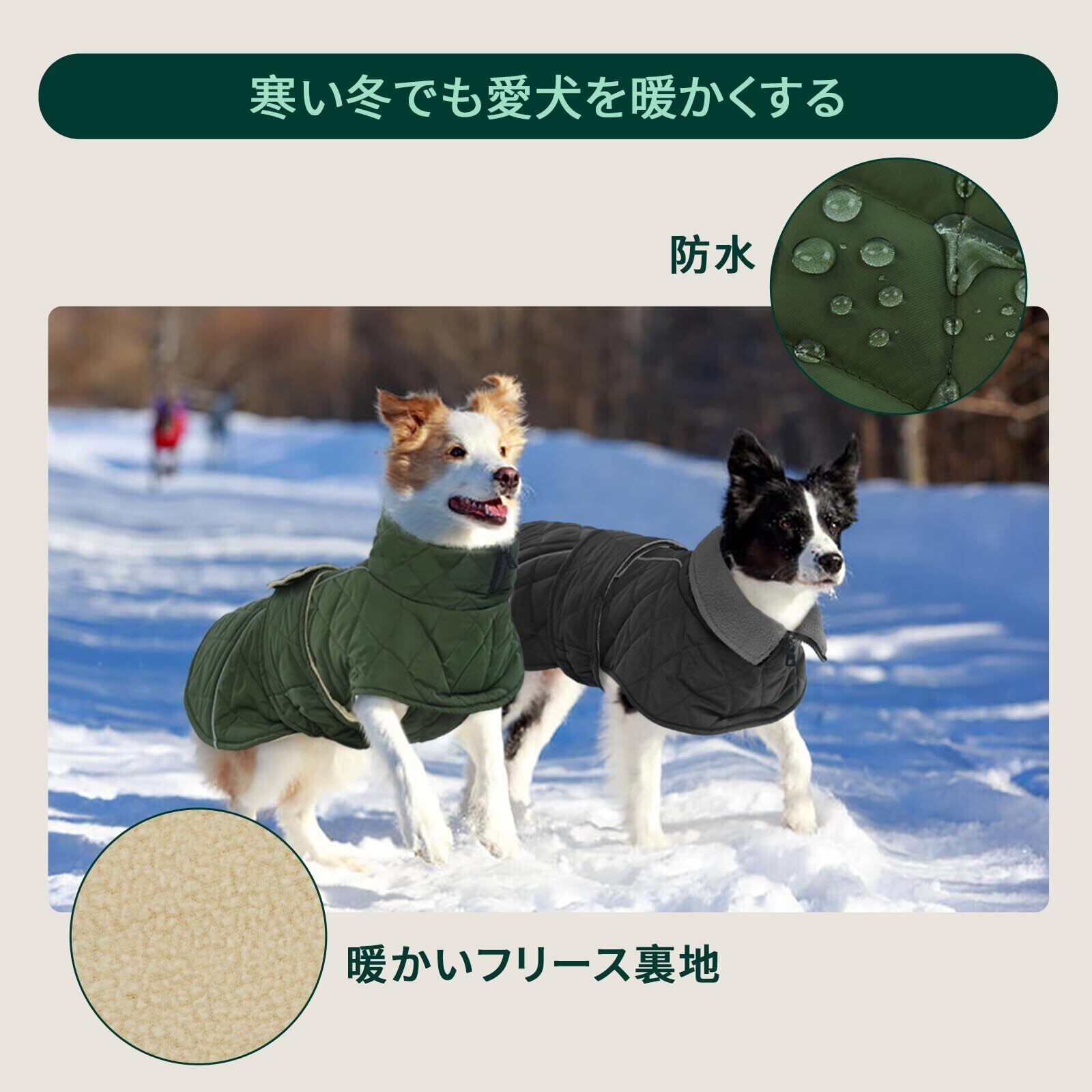 Kuoser犬服 犬用コート 防寒ジャケット 冬服 防水素材 フリース襟 マジックテープ調節 ハーネスホール 反射テープ付き ファスナー付き 犬用アウトウエア グリーンL 胸囲53-62cm