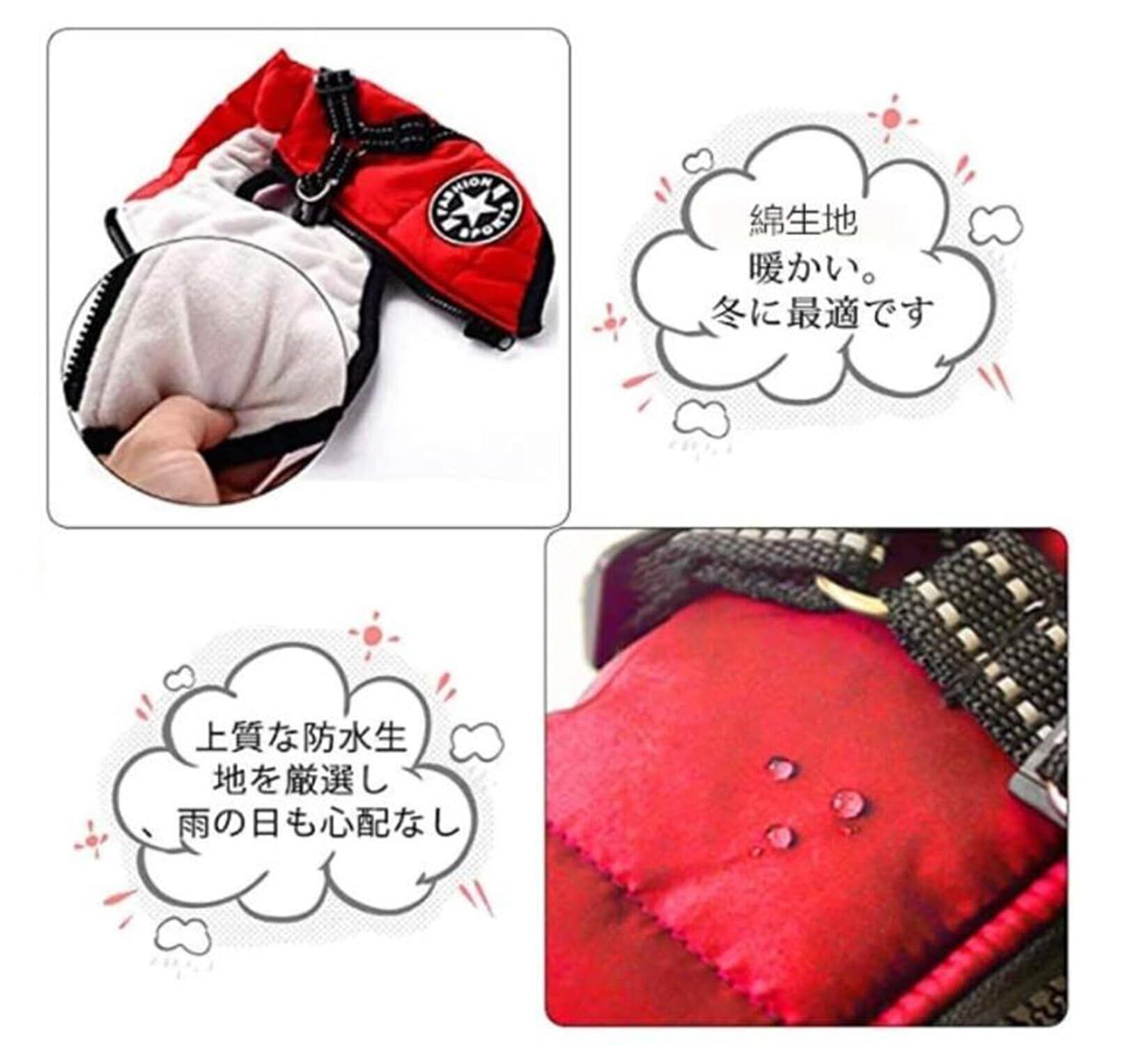 撥水加工で、雨の日でも安心です。散歩が好きなワンちゃんには最適。温かい室内から寒い屋外に出る時に暖かいスポーティーで動きやすいダウンジャケットを用意しましょう。