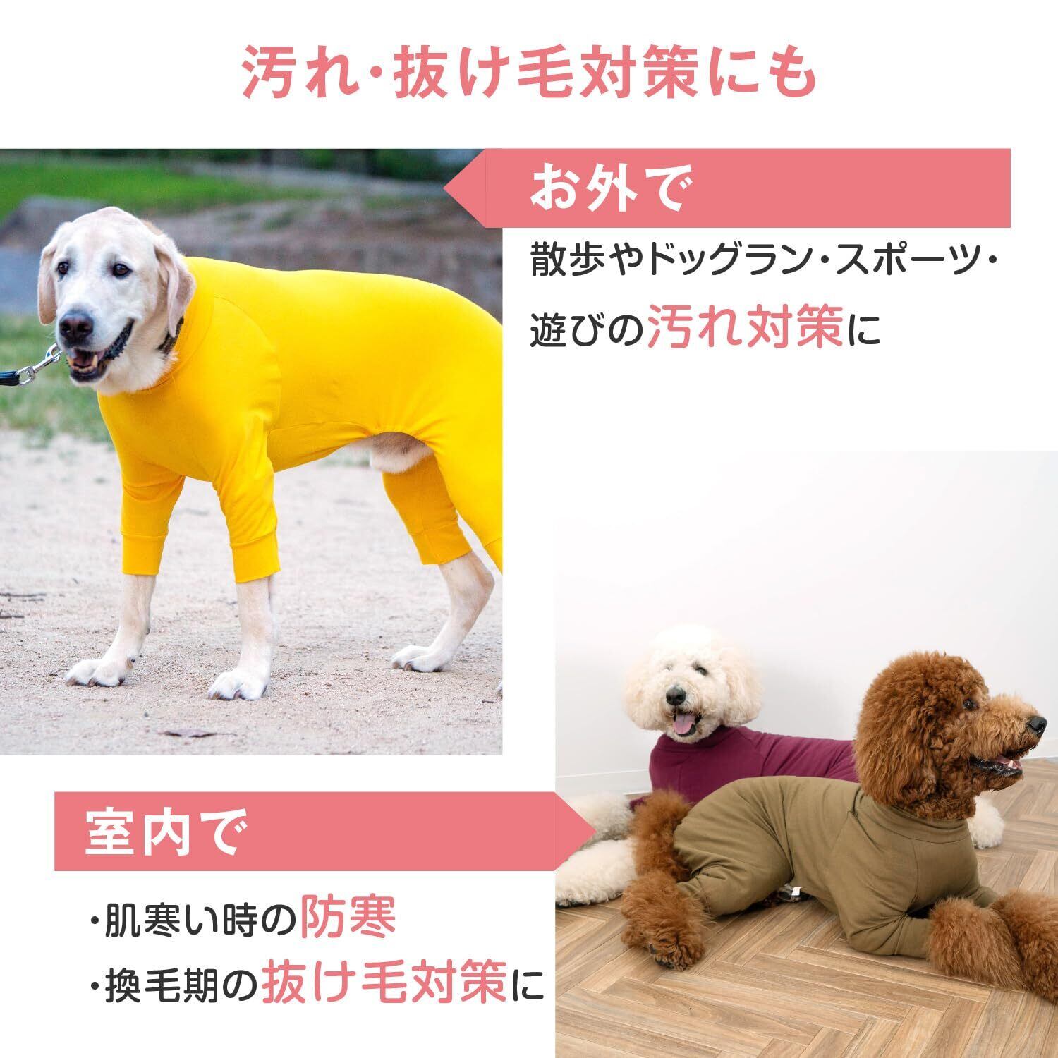 ヘビーローテーションの長袖インナーつなぎ。 当店での再購入や複数購入など、シリーズ累計のリピート率が高い商品。 お部屋着や、いつものお散歩に。デイリーに使えるストレスフリーな長袖インナーつなぎ。 着せて実感!驚くほど伸縮性があり、体にフィットして保護するウエア。 しっかり伸びる素材だから、お洋服を着るワンちゃんも、着せるパパ・ママにも快適なアイテム。 シンプルなデザインだから、1枚で着るのも良し、寒い時は重ね着しても合わせやすい優秀なウエアです。