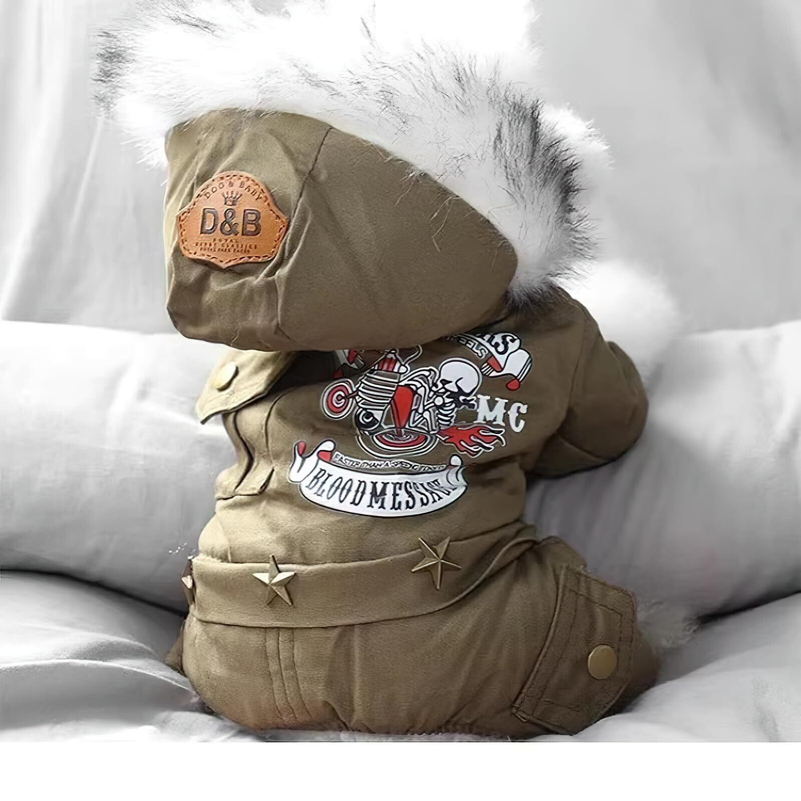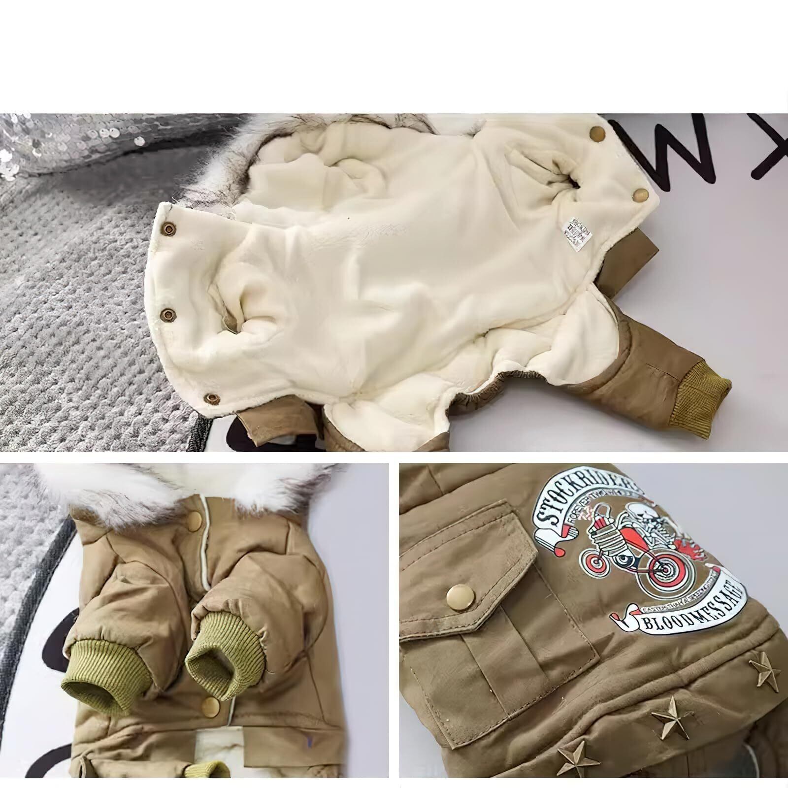 ロンパースデザイン:この犬用の服はロンパース型のデザインで、つなぎ(カバーオール)スタイルです。ロンパースとは、全身を包むように作られた衣類のことを指し、犬の体全体をカバーするため、寒さからしっかりと守ってくれます。特に足元まで覆うため、冷えやすい部分もしっかりと防寒できます。使用されている素材は、防風性も考慮されています。風を通しにくい生地が選ばれており、寒い季節でも外部からの冷たい風を遮断します。