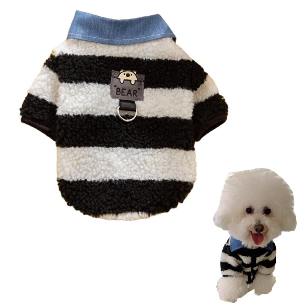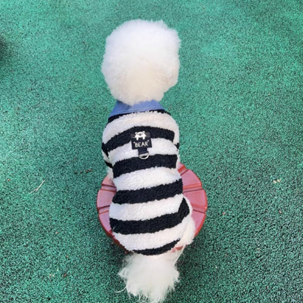 【優れたデザイン】このペット用服はストライプをメインに、襟元には青いデニム生地のスタンドカラーを配し、前開き部分はボタンで留めることができます。背中の中央には「BEAR」という文字がプリントされた革製のタグがあり、まるで小さなくまのぬいぐるみのようで愛らしいです。また、本体にはリード用のカラビナフックも備えており、ペットの外出をよりスタイリッシュで便利にしてくれます。