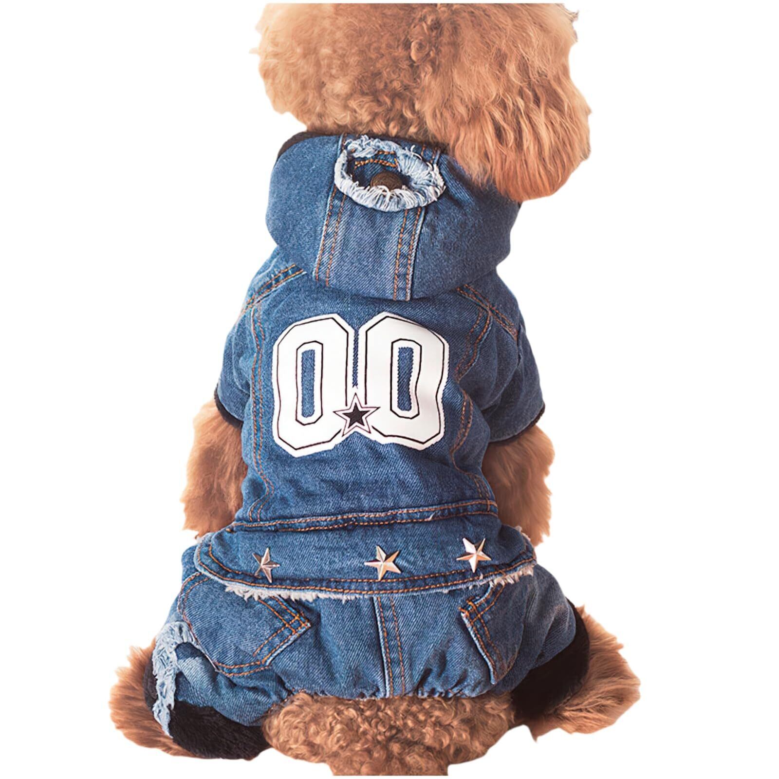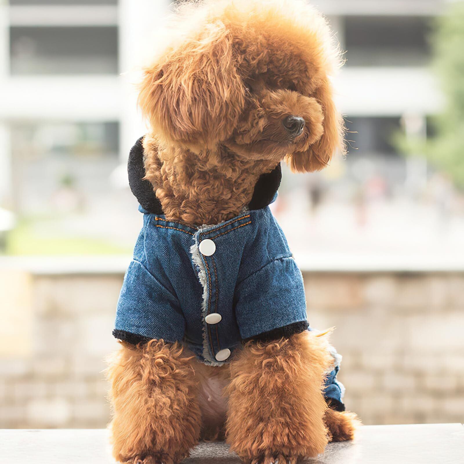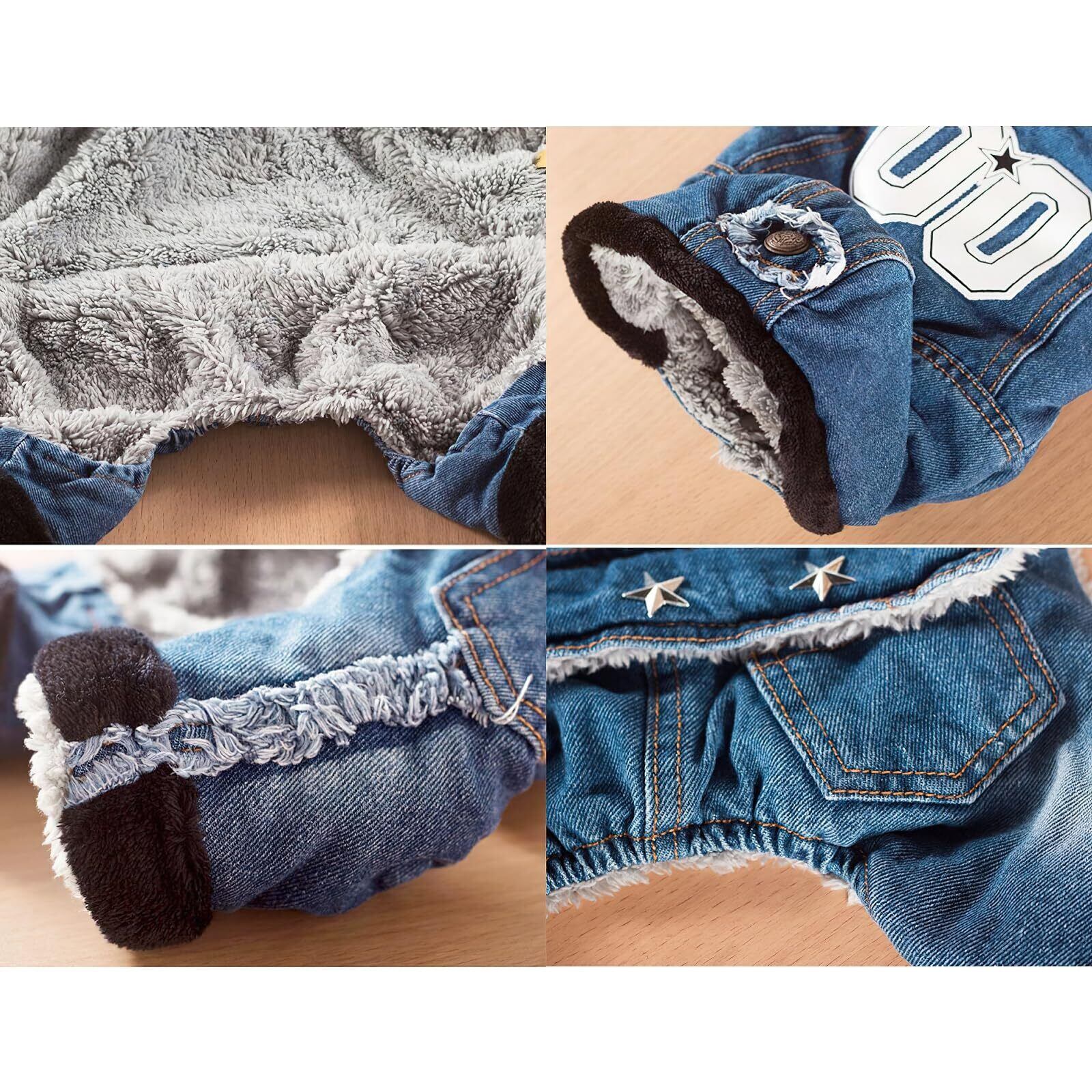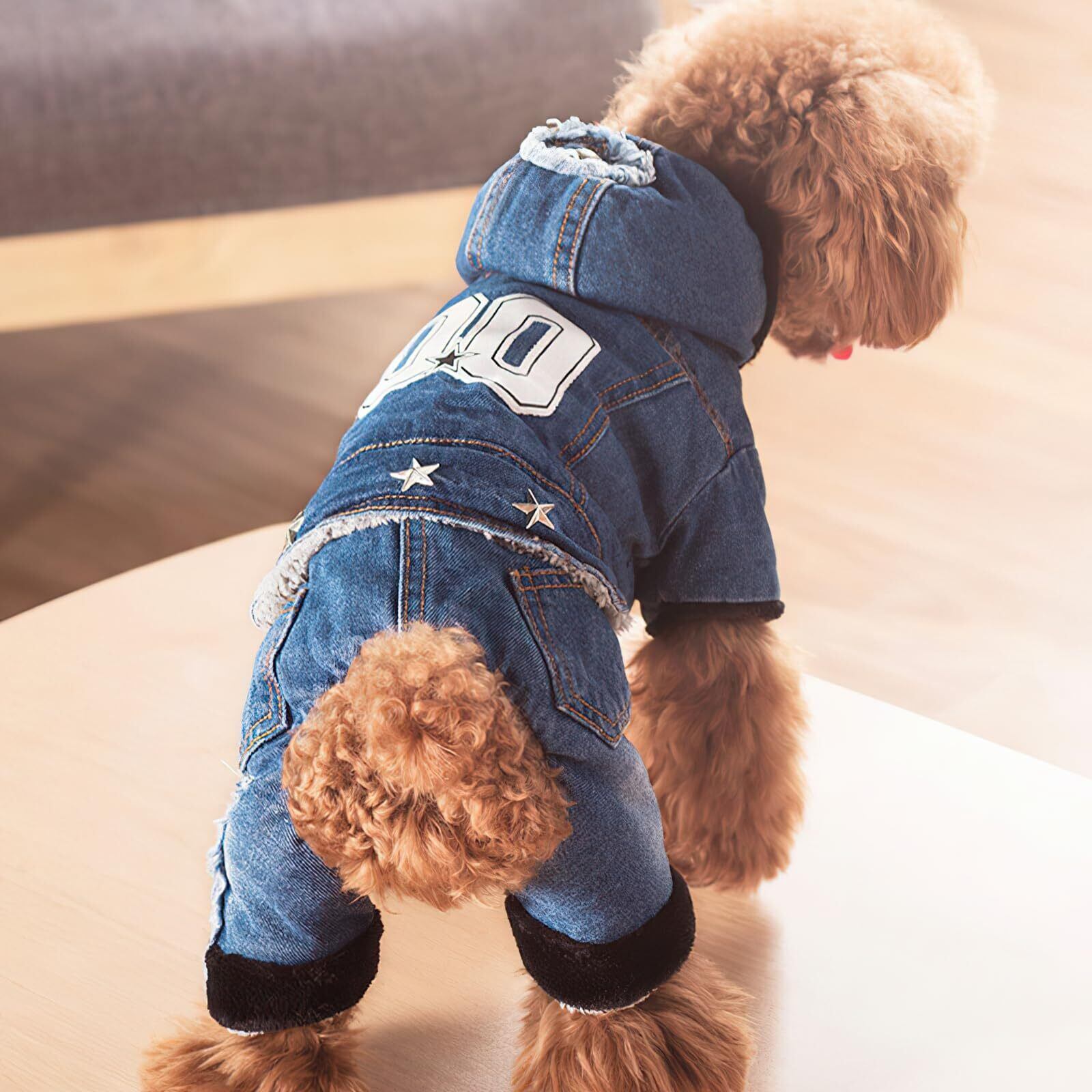 [SeitenFB]犬の服 デニムつなぎ スナップボタン式ロンパース ペット服 ふわふわ 前開き 裏起毛 フード付き 犬用防寒着 あたっかい 秋冬 コスチューム ドッグウェア オールインワン 小中型犬 寒い冬もお散歩大好き! XL