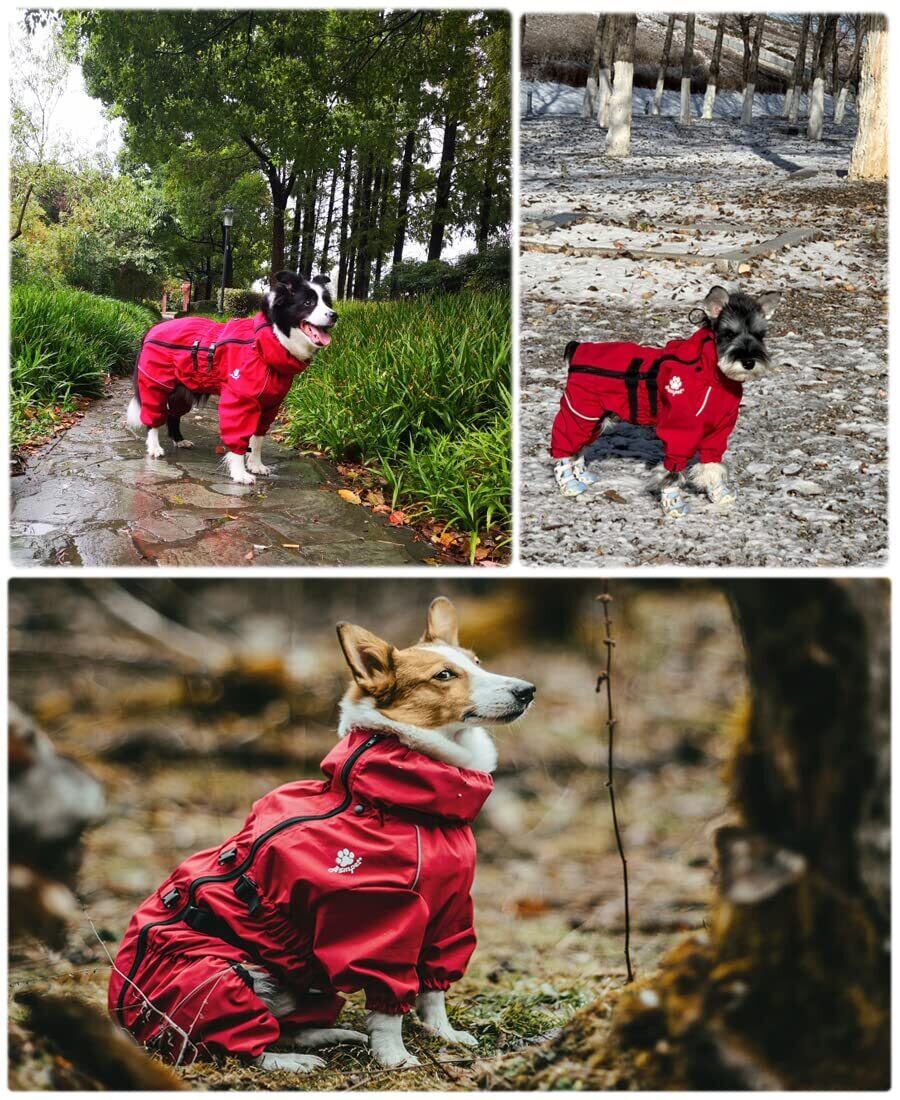 ❀【ユニセックス】全身レインコートとジャケット、一年中ご利用いただけます。腹部のラップアラウンドデザインは、腹部を汚れから守ります。下腹部と臀部は完全に開いたデザインで、二次調整なしで男性と女性の両方の犬に適しています。背面にはハーネスと併用できるトラクションホールが設置されています。
