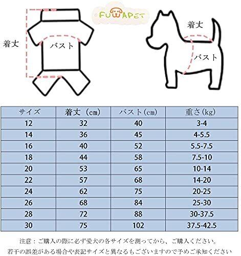 【小型・中型・大型犬適用サイズ】 12号:着丈32cm、バスト40cm、重さ3-4kg。 14号:着丈36cm、バスト45cm、重さ4-5.5kg; 16号:着丈40cm、バスト52cm、重さ5.5-7.5kg。 18号:着丈44cm、バスト58cm、重さ7.5-10kg; 20号:着丈53cm、バスト65cm、重さ10-14kg。 22号:着丈57cm、バスト68cm、重さ14-20kg; 24号:着丈62cm、バスト75cm、重さ20-25kg。 26号:着丈68cm、バスト84cm、重さ25-30kg; 28号:着丈72cm、バスト88cm、重さ30-37.5kg。 24号:着丈75cm、バスト102cm、重さ37.5-42.5kg。 注意:ご購入の際に必ず愛犬の各サイズを測ってから、ご購入ください。若干の誤差がある場合や表記サイズと異なるもございますので予めご承知ください