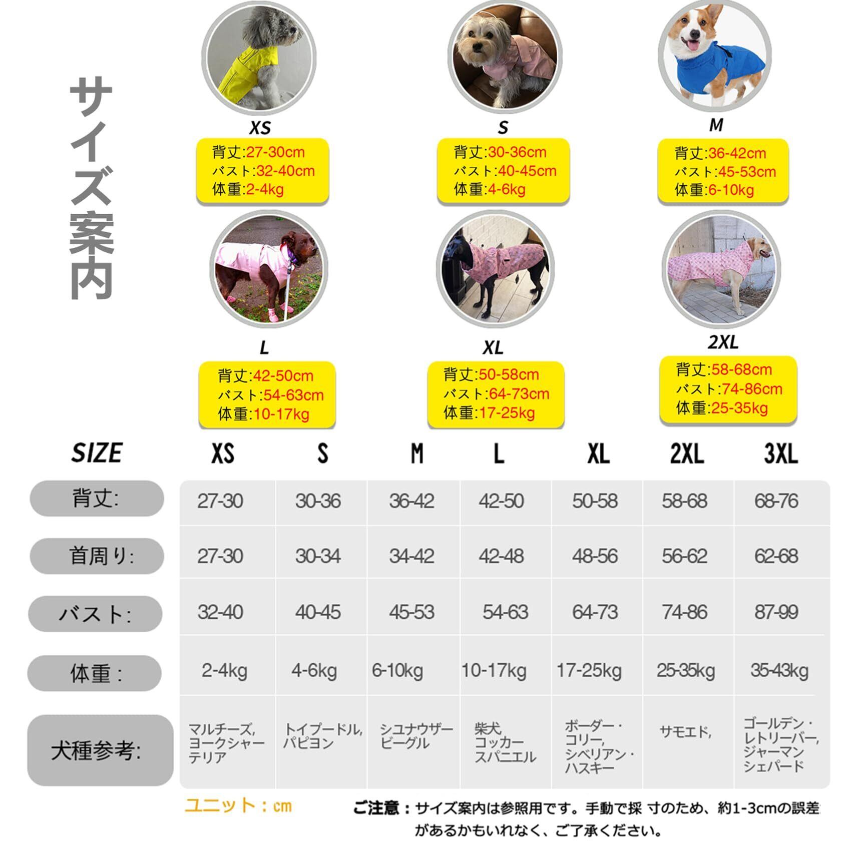 【多犬種】超小型犬、小型犬、中型犬、大型犬、超大型犬などに適している犬レインコート:xs~3xl。ご注意ください:ポリエステルの素材で、伸縮性がありません、ご購入の時、愛犬の体型より大きなサイズをお選びください。サイズ表は人工測定で1-2センチメートルの誤差があるかもしれません。