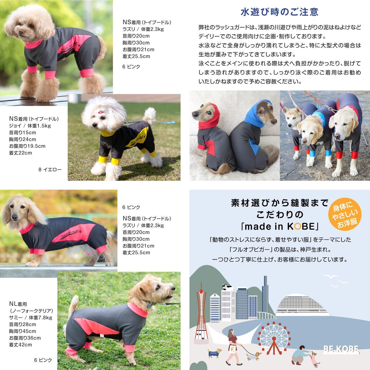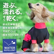 撥水性のあるラッシュガードは、レインウェアとしても使えます。 水着のようなつるつるとした質感で、高いストレッチ性を持つ素材です。砂や枯れ葉がつきにくいため、水遊びやさまざまなスポーツシーンに適しています。 優れた吸水・速乾性で肌をサラサラに保ち、高いUVカット効果と耐塩素性も備えた新感覚のストレッチ機能素材です。 両サイドに切り替えを入れ、スポーティーなロゴをプリントしました。 ワンちゃんを気にさせないシャカシャカ音のしない、長年愛用されている定番のレインウエアです。