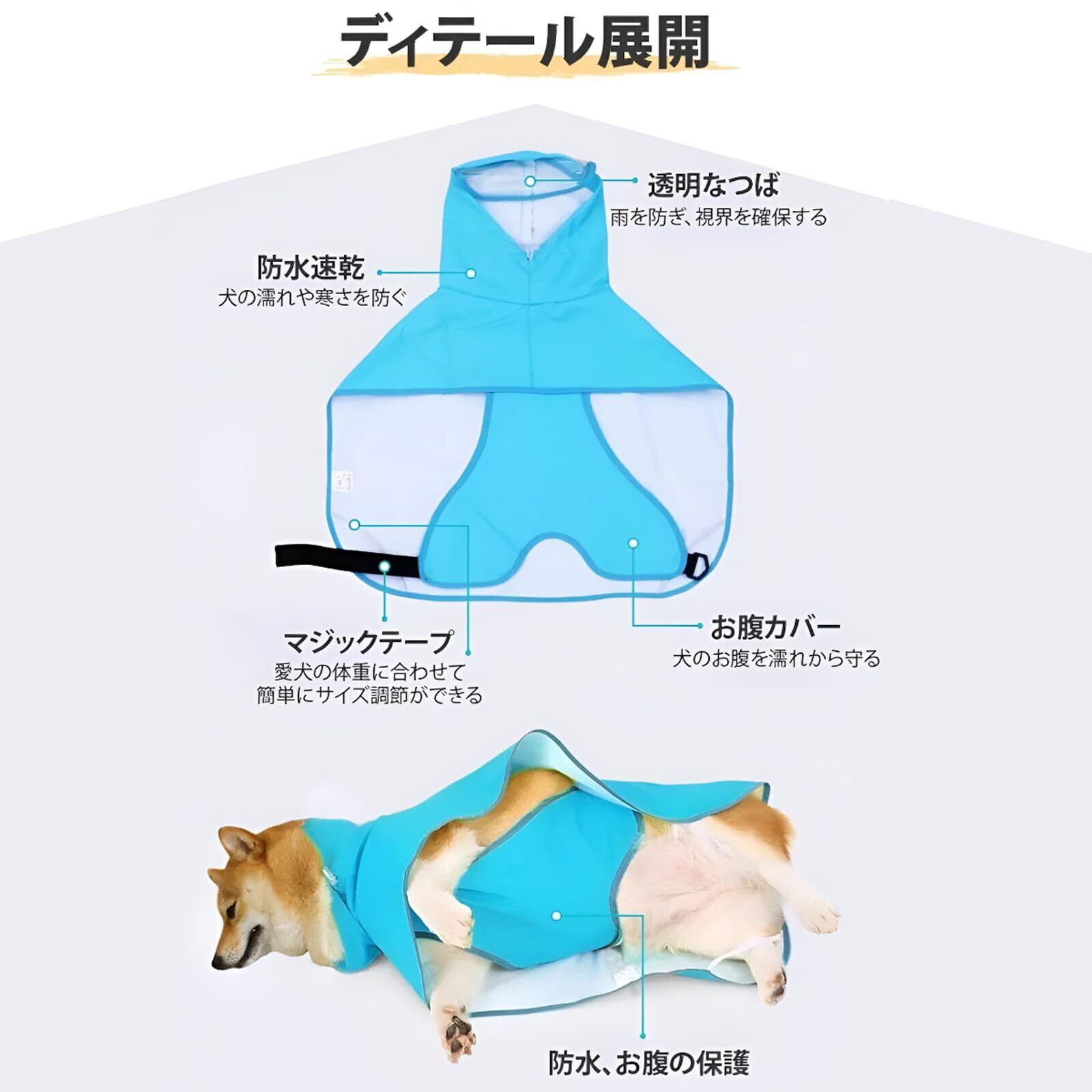 【 雨・風・冷えから守るフルカバーデザイン】防水性に優れた軽量素材を採用し、速乾&防風機能で突然の雨でも安心。お腹まですっぽりカバーする設計で、地面からの跳ね返りや冷えを防ぎ、愛犬の健康をしっかりサポート。