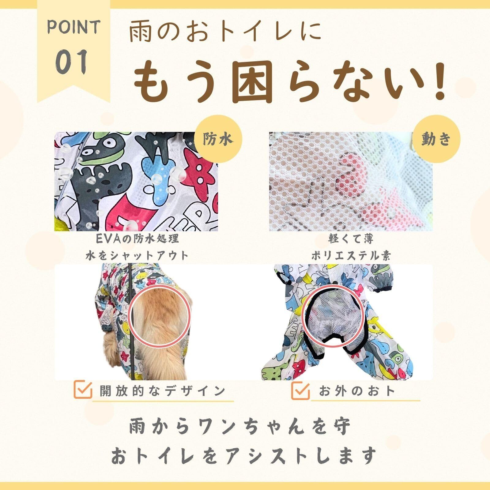 【雨の日のトイレ対策】 室内での排泄を嫌がり、お散歩のときにしか排泄をしない愛犬の場合、雨の日の排泄の悩みを解決します。生地全体を撥水コーティングし、雪遊びや小雨、または急な雨の際や、雨上がりのお散歩には最適です。