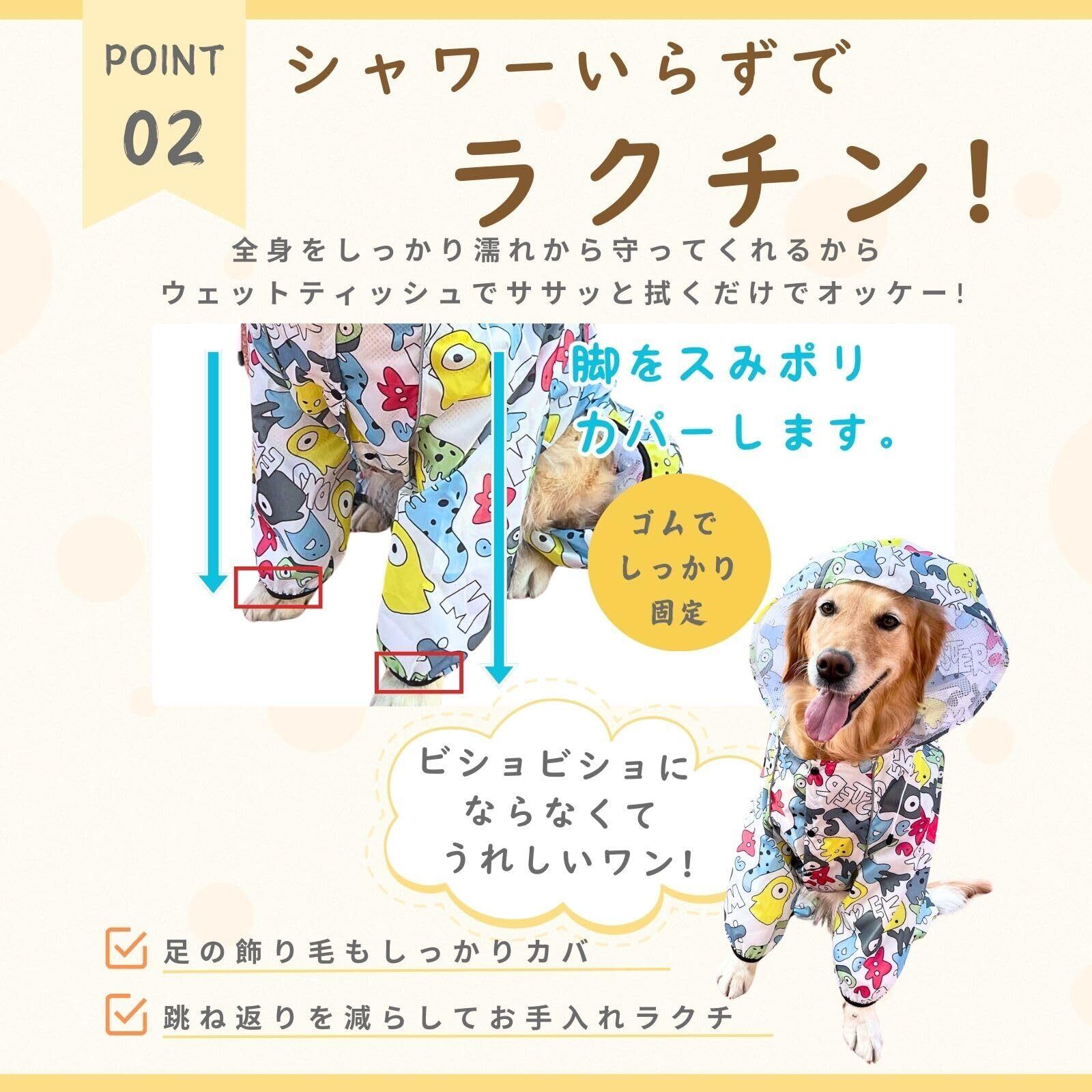 【梅雨時期のお散歩に】 便利なリード穴付き、犬用リードと一緒に使うと、雨の日でも愛犬との散歩することができます。全身を覆ってくれるレインコートです。お腹も脚も、しっかりカバーできます。帽子はドローコードで調整可能で、頭ブルブルを振っても外れにくいですよ。